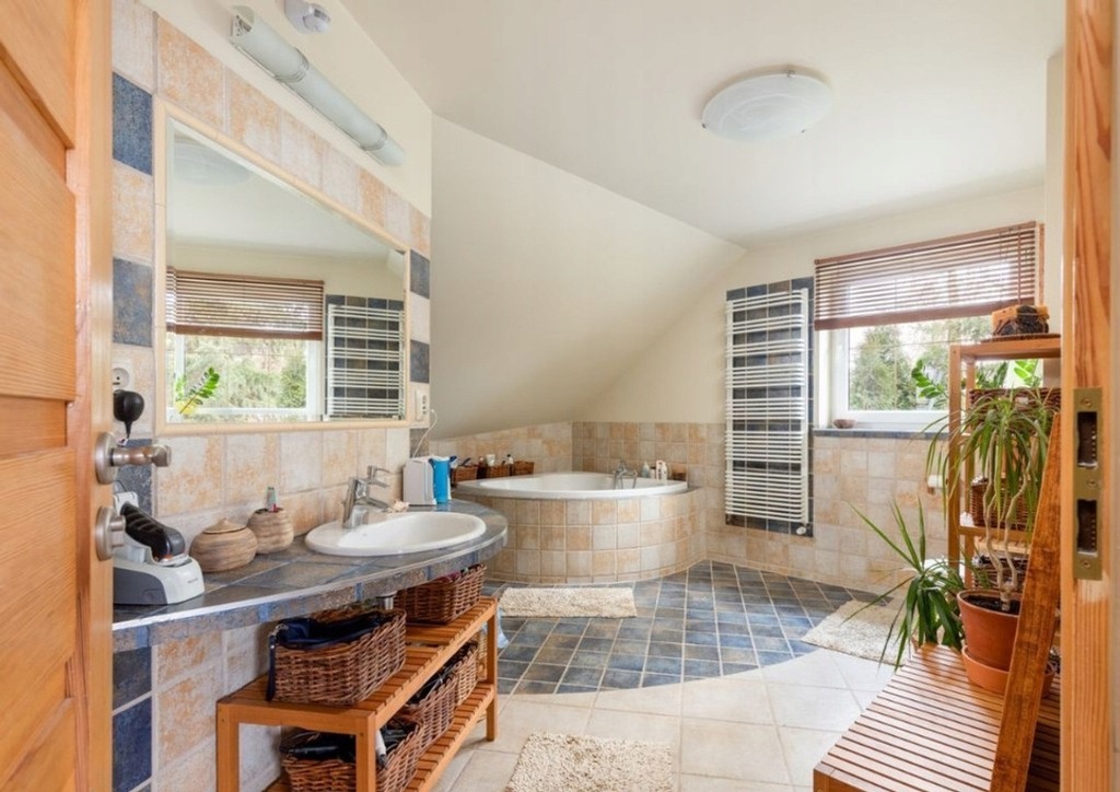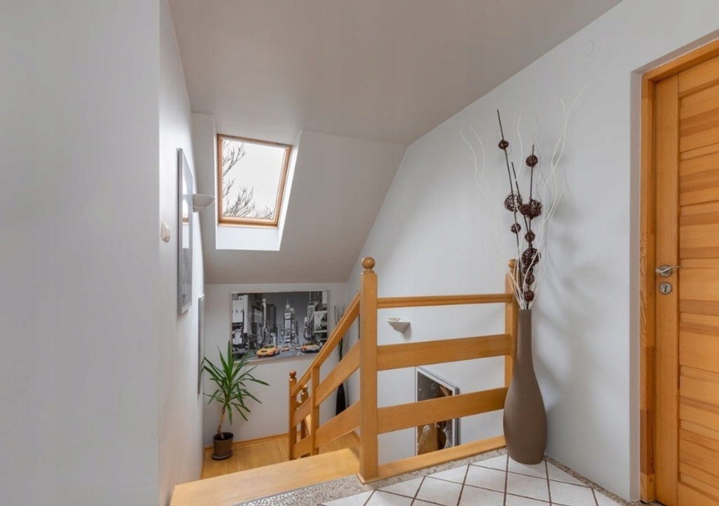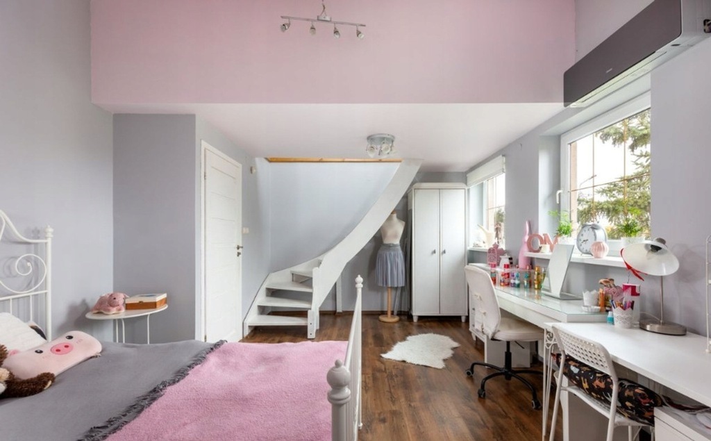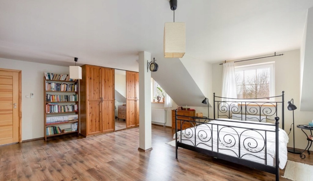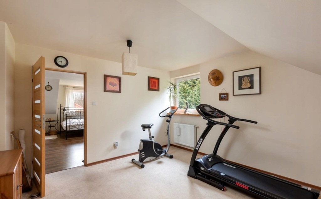 Na piętrze znajdują się trzy sypialnie i pokój do fitnessu (lub kolejna sypialnia) oraz duża łazienka z oknem (a właściwie pokój kąpielowy).