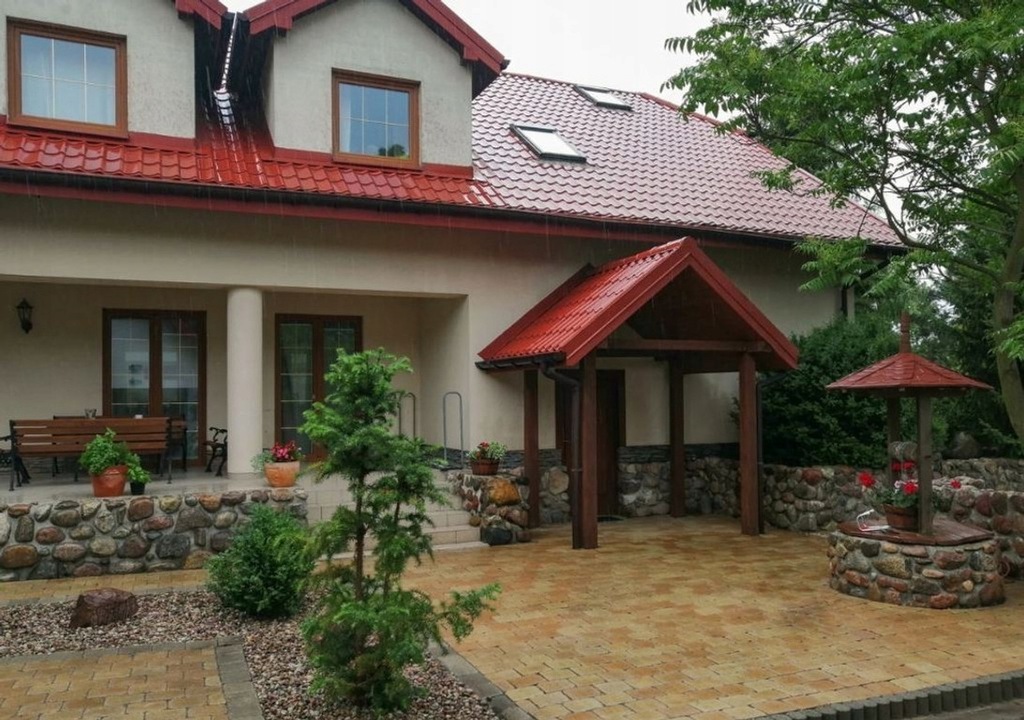 · ogród dolny to bardzo kameralna część posesji z pięknym, zadbanym trawnikiem, bajecznym basenem o naturalnym kształcie, drewnianym molo oraz malowniczą kaskadą wodną. Drewniana altana z meblami i wymurowanym ręcznie grillem z funkcją wędzarni. Za ogrodzeniem znajdują się jedynie pola i drzewa, tak więc z wszelkich atrakcji tego miejsca można korzystać bez najmniejszego skrępowania.