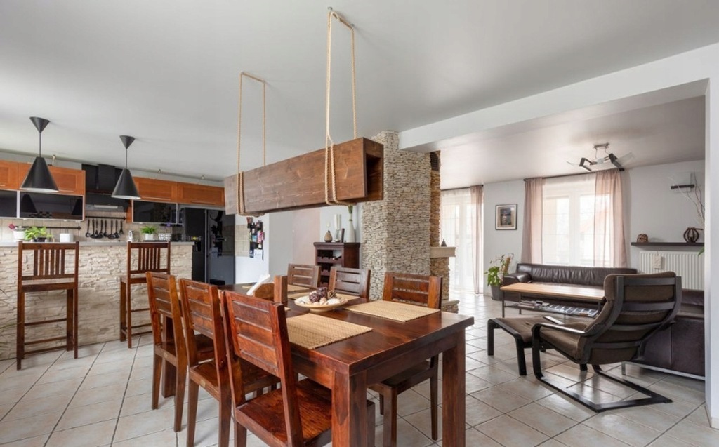 Dom jest wykończony w stylu naturalnym, z akcentami w klimacie śródziemnomorskim. Położne glazury i terakoty mają nieregularne krawędzie oraz matowe powierzchnie kolorem i fakturą nawiązujące do materiałów naturalnych. Ułożone przez artystę-plastyka, co szczególnie zwraca uwagę w obu łazienkach (ręcznie łupane krawędzie, ciekawe łuki itp.). Wszystkie drzwi, schody, parapety oraz większość mebli wykonana jest z litego drewna, w tym wiele ręcznie, na indywidualne zamówienie w polskiej manufakturze. Całość aranżacji stonowana i przyjazna, dająca ciepły i spokojny klimat.