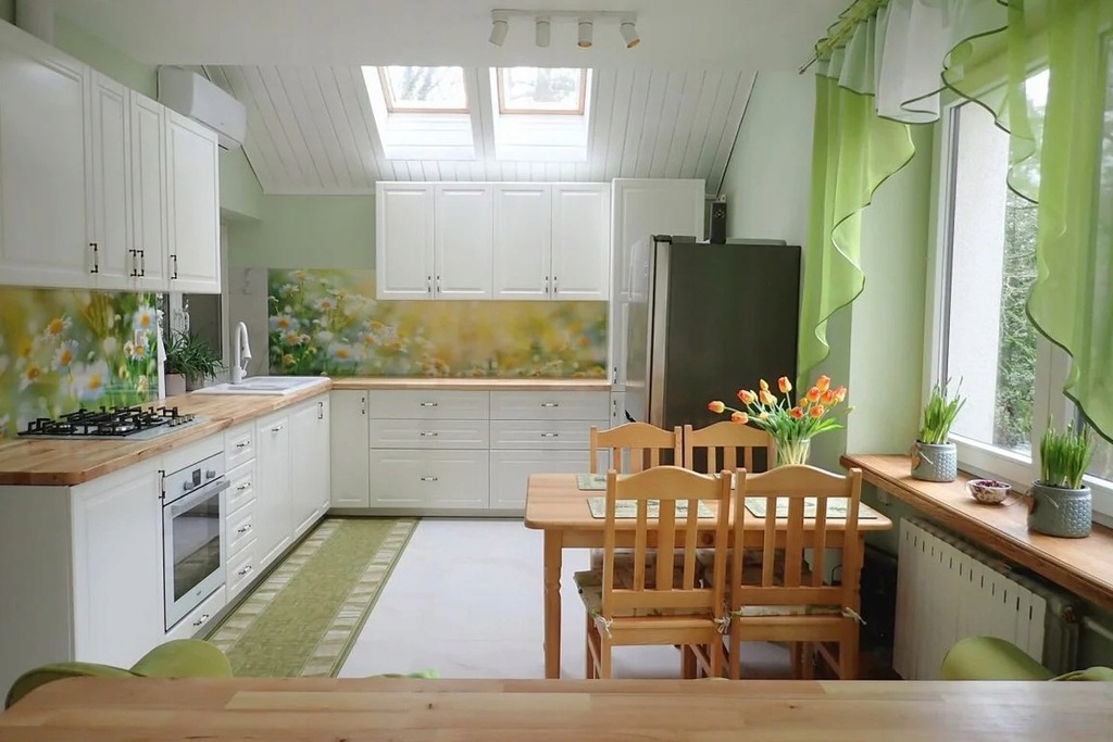 Wnętrze domu jest przestronne i jasne, ogromne okna salonu wychodzące na ogród wręcz zapraszają, by wejść, rozsiąść się i rozkoszować widokiem zieleni. Ogród zamieszkują stada ptaków, jeże, wiewiórki. Nie tylko ludzie, ale i zwierzęta czują się tu szczęśliwie i bezpiecznie.