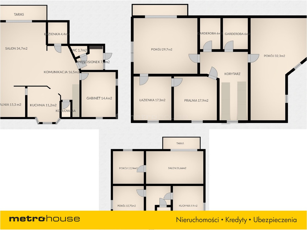 Nieruchomość złożona z: • salon 34,7 m.kw• jadalnia 15,3 m.kw• kuchnia zamykana z oknem 12,2 m.kw• hall 16,5 m.kw• gabinet 14,4 m.kw• wiatrołap 7,4 m.kw• wc 1,7 m.kw• łazienka 4,4 m.kw• kotłownia 3,3 m.kw• łazienka główna 17,3 m.kw• pralnia 17,9 m.kw• sypialnia 29,7 m.kw• garderoba 6 m.kw• garderoba 6 m.kw• pokój 32,3 m.kw• korytarz 19,8 m.kw• wiatrołap 1,32 m.kw• przedpokój 8,12 m.kw• kuchnia zamykana z oknem 9,9 m.kw• salon 21,66 m.kw• pokój 12,24 m.kw• pokój 15,75 m.kw
