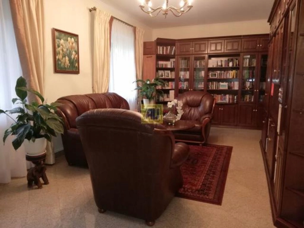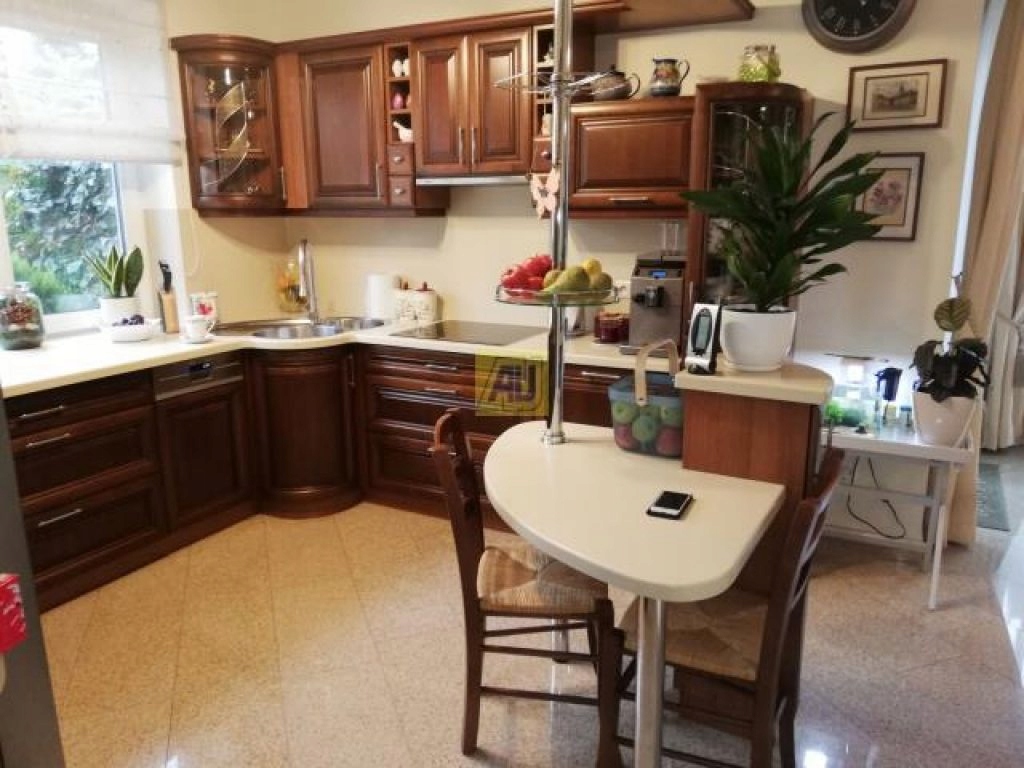 przestronny salon i jadalnia, z wyjściem do oranżerii, biblioteka/gabinet, kuchnia , spiżarnia obok kuchni, wiatrołap, hol, WC dla gości, kotłownia z pralnią oraz drugą roboczą kuchnia, z której jest wejście do garażu i części gospodarczej. Odrębną, prywatną część budynku stanowią 3 sypialnie - jedna z łazienką i garderobą, dwie pozostałe sypialnie z łazienką wspólną.