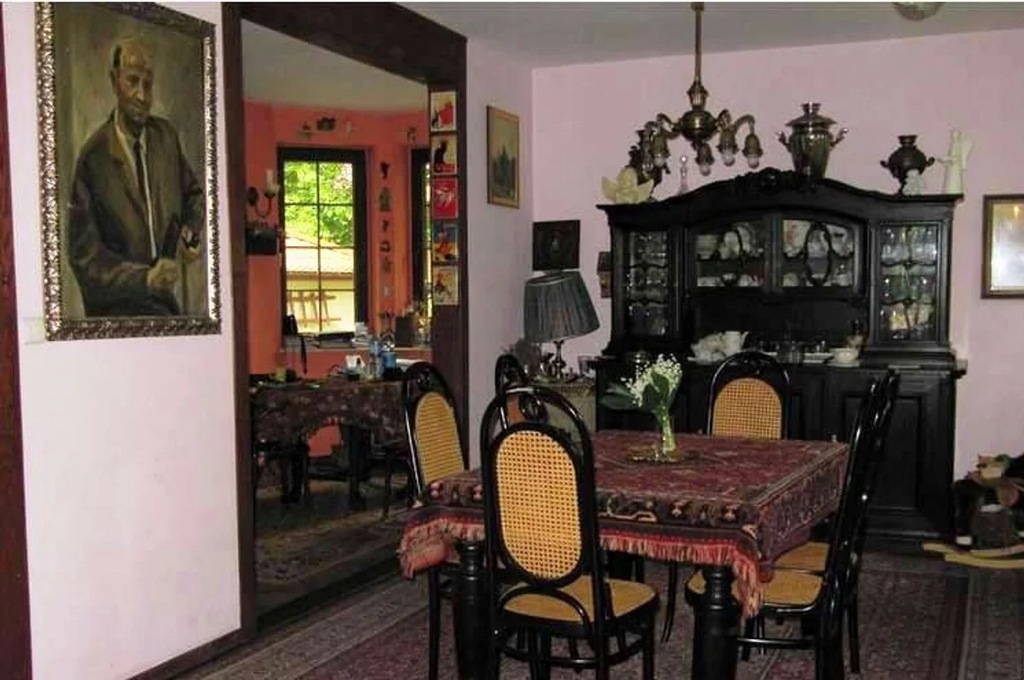 Parter - łącznie 161mkw.: salon o pow.44mkw. z kominkiem i wyjściem na zadaszony taras (20m kw.) od strony zachodniej, salon doświetlony wykuszem od strony południowej,widna kuchnia (11,5mkw.) oddzielona barkiem od jadalni z wykuszem; przy kuchni spiżarnia; gabinet 17mkw., sypialnia 21mkw. z własną łazienką 6,7mkw., garderoba 7,5mkw. z oknem, łazienka dla gości 5,5mkw.; przedsionek, przestronny hall, bardzo ciekawie zaaranżowana klatka schodowa z przeszkleniem autorstwa artysty plastyka Łączyńskiego.