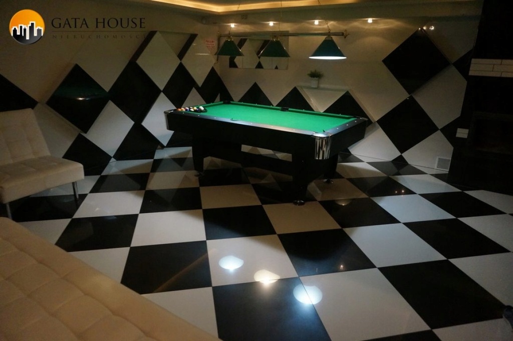 W piwnicy znajduje się garaż, pralnia, spiżarnia-winiarnia, pokój kominkowy, pokój rekreacyjny, sauna oraz wyjście do ogrodu.