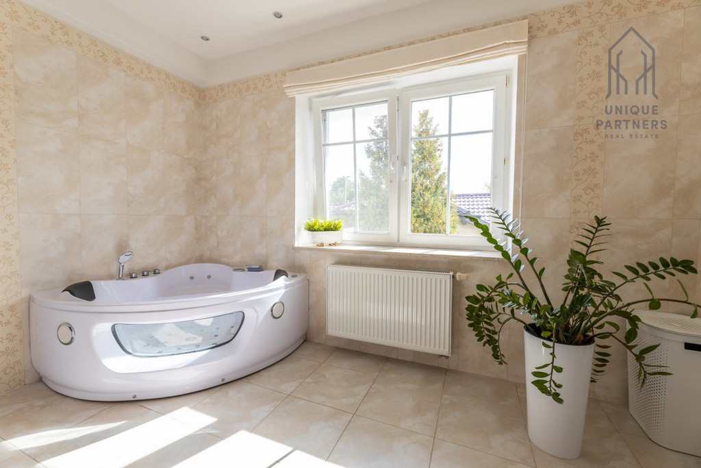 Zdecydowanym atutem nieruchomości jest duży podgrzewany basen z pełną infrastrukturą, altanka grillowa oraz pięknie zagospodarowany ogród z zadaszonym tarasem. Duża ilość nasadzeń osłania działkę przed wzrokiem sąsiadów co zapewnia pełną prywatność i intymność właścicielowi. Oferowany dom jest świetną propozycją dla rodzin z dziećmi jak również osób ceniących sobie spokój, prywatność oraz komfort mieszkania.