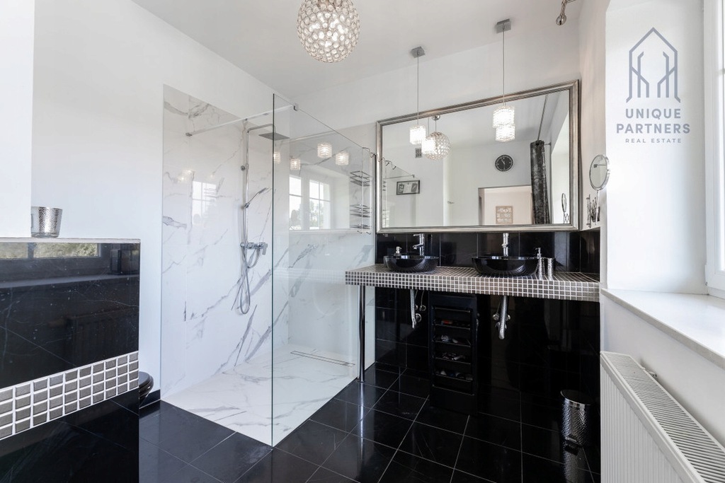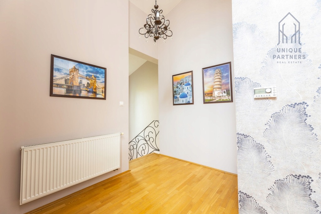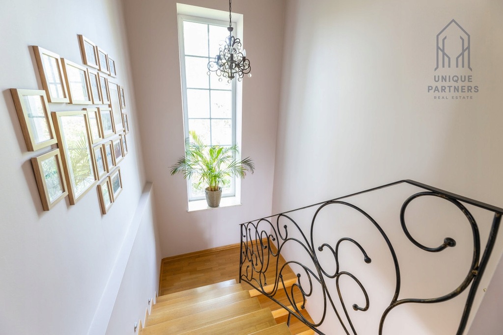 Na piętro prowadzi nas bardzo dobrze doświetlona klatka schodowa dzięki wysokiemu oknu. Główna sypialnia od strony południowej z wyjściem na balkon, oddzielną garderobą oraz prywatną łazienką z prysznicem z odpływem liniowym oraz WC.