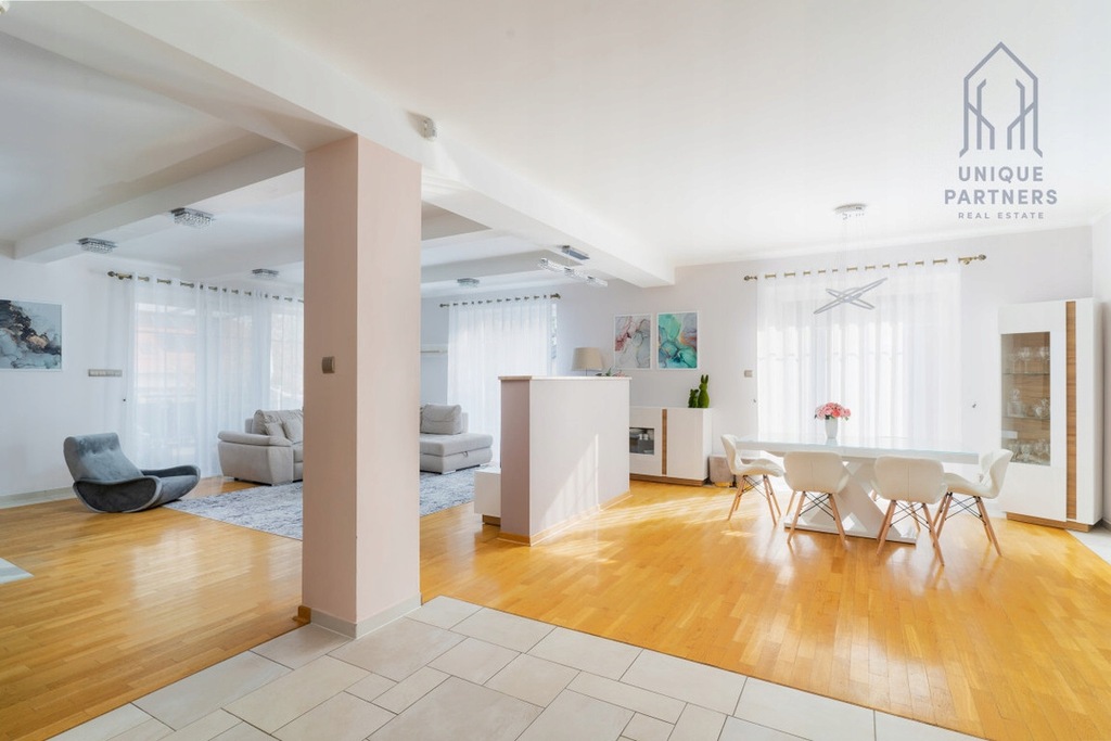 Od samego wejścia do domu wchodzimy do przestronnej przestrzeni komunikacyjnej skąd bezpośrednio przechodzimy do dużego dobrze doświetlonego salonu połączonego z jadalnią oraz częściowo oddaloną, wyposażoną w sprzęt AGD kuchnią. Dodatkowo mamy do dyspozycji oddzielne pomieszczenie z przeznaczeniem na domowe biuro/ bibliotekę bądź sypialnię. W strefie dziennej również łazienka oraz garderoba. Dużym atutem jest okalający taras ponad 80 m2, do którego mamy dostęp zarówno z salonu jak i kuchni.