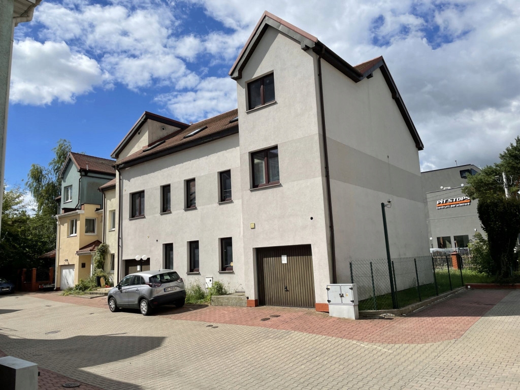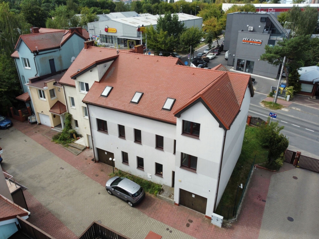 Na sprzedaż budynek mieszkalny w zabudowie szeregowej (skrajny segment) o powierzchni użytkowej około 342 m2 i powierzchni zabudowy 143 m2. Dom posadowiony jest na działkach o łącznej powierzchni 313 m2. Budynek posiada 2 kondygnacje oraz poddasze użytkowe, a w jego bryle znajdują się dwa garaże.