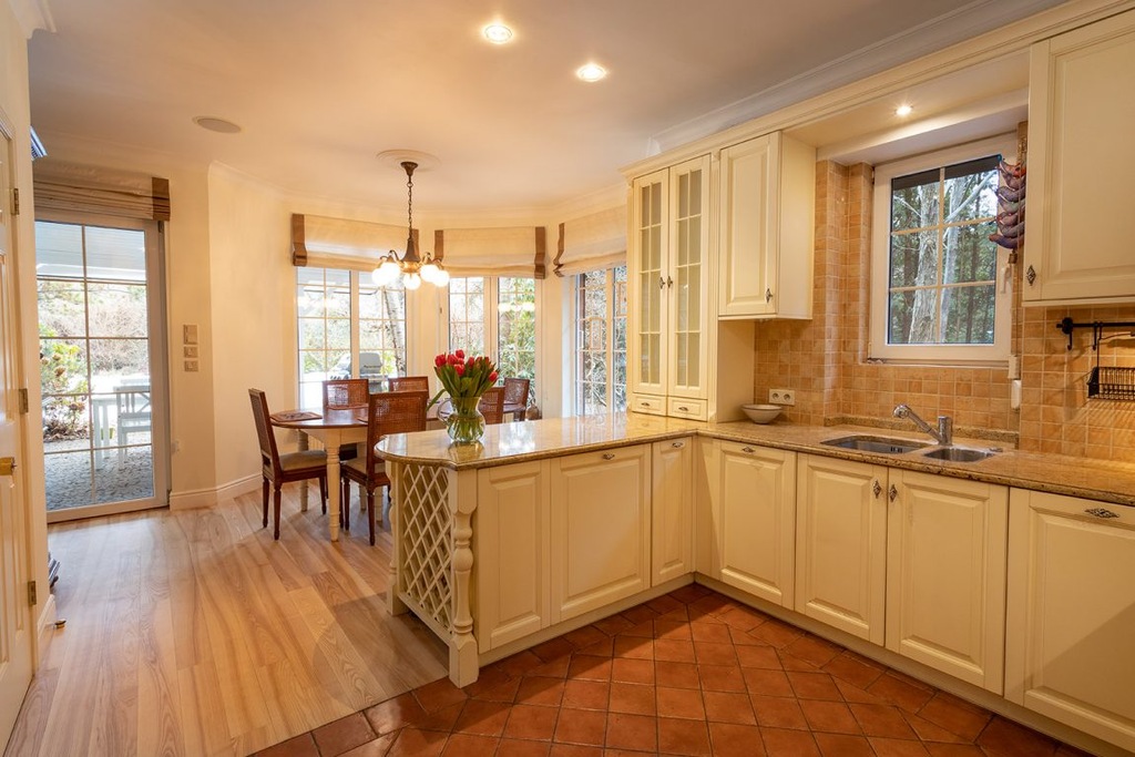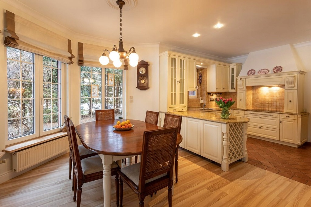 Kuchnia ,która jest otwarta na jadalnie została urządzona w każdym najmniejszym szczególe przez właścicielkę tego domu ,zaczynając od mebli kończąc na spiżarce ,która jest genialna szczególnie przy organizowaniu przyjęć czy innych uroczystości.