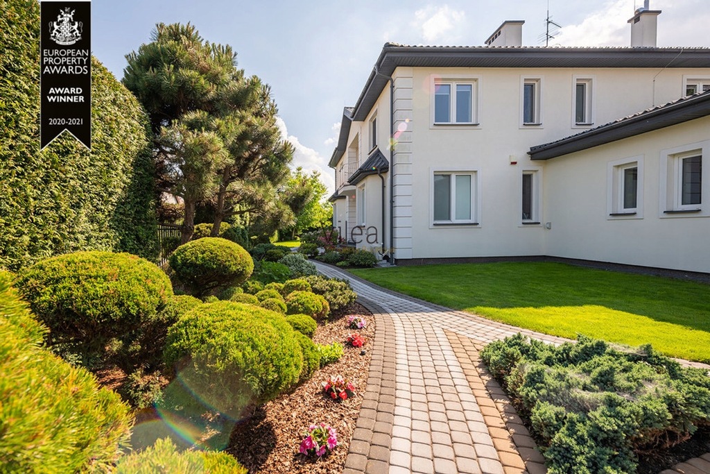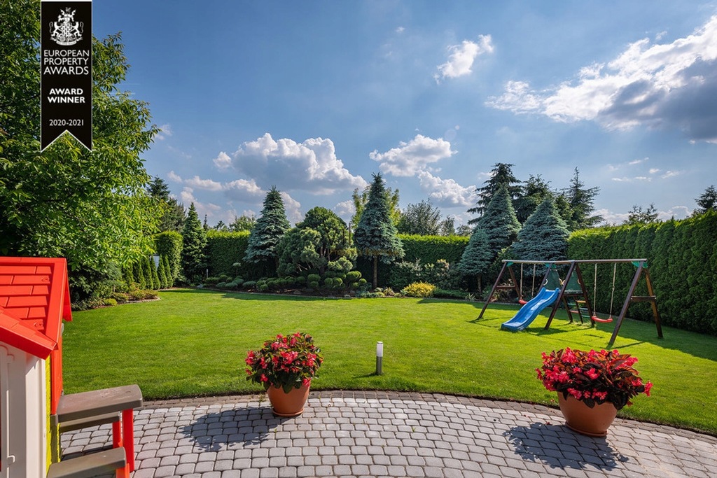Budynek znajduje się na działce o powierzchni 1299 m2 i otoczony jest 15-letnim, pięknie oświetlonym ogrodem, kształtowanym przez ogrodników w cotygodniowym serwisie. Na całości rozprowadzone jest podlewanie automatyczne. O bezpieczeństwo mieszkańców dba system alarmowy podzielony na strefy, dający możliwość aktywowania w poszczególnych częściach domu. Okna i szyby antywłamaniowe, drzwi wejściowe oraz między garażem a częścią mieszkalną - z okuciem antywłamaniowym.