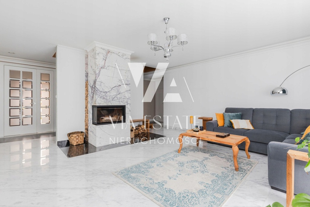 Dodatkowym atutem nieruchomości jest ogrzewanie podłogowe na całej powierzchni domu oraz piękny kominek usytuowany w salonie obłożony efektownym marmurem.