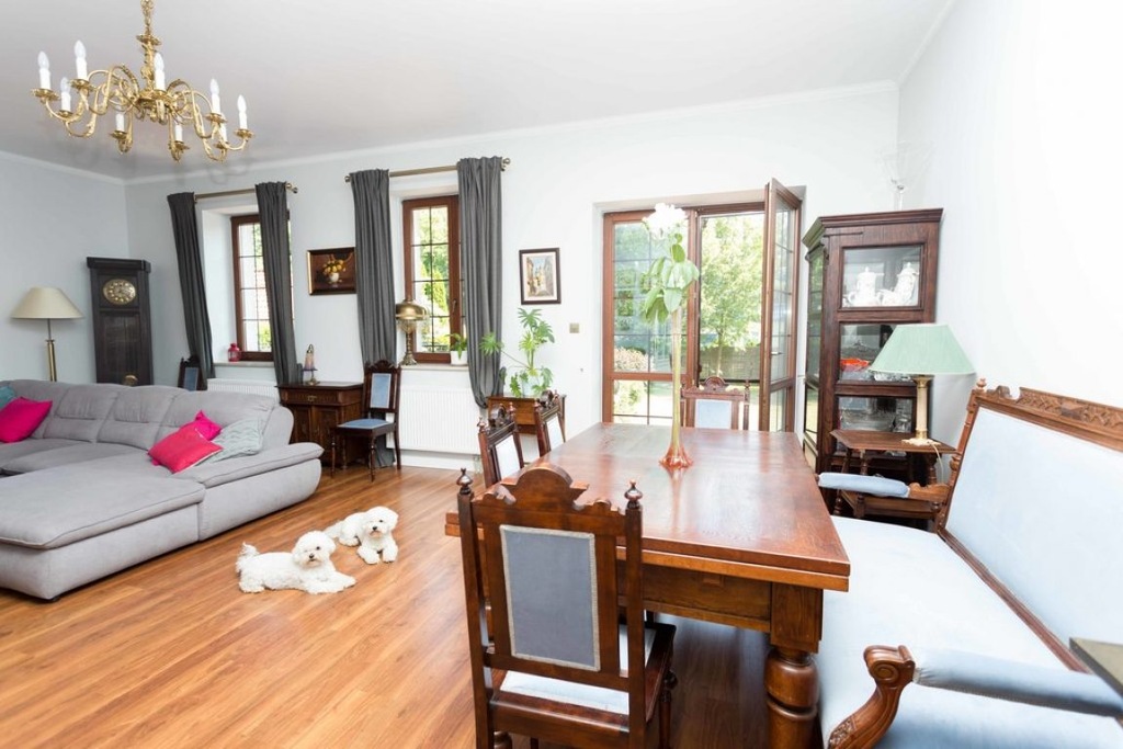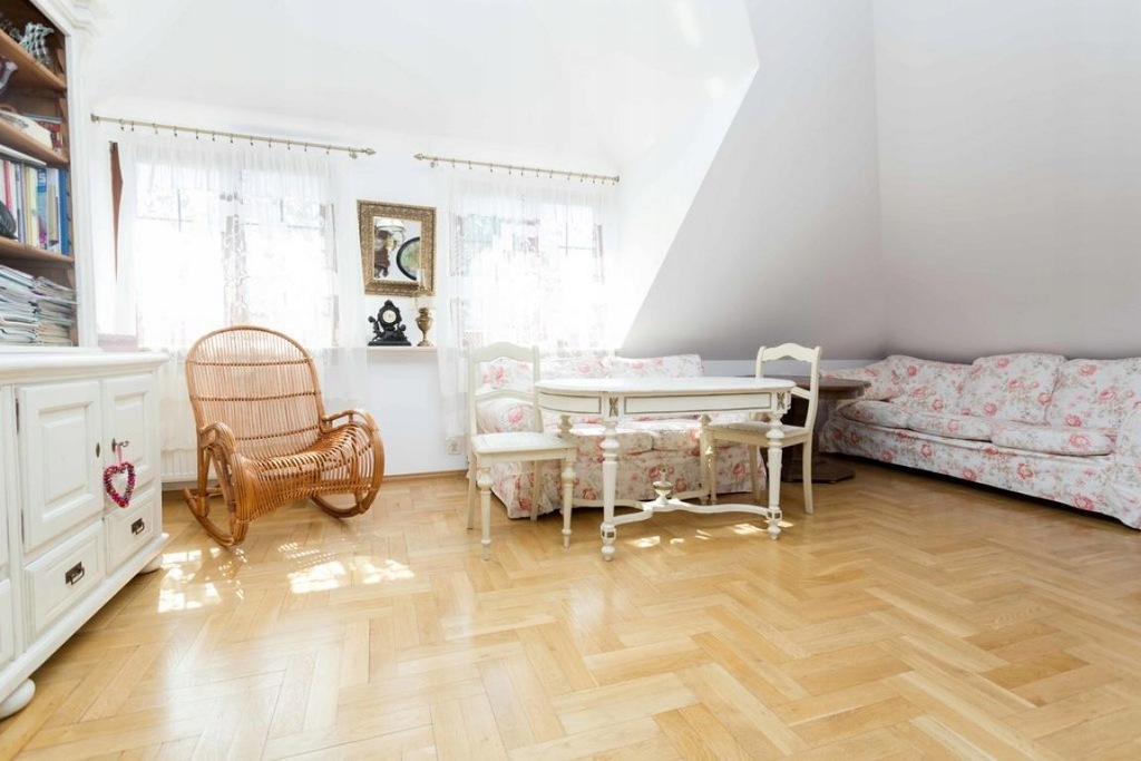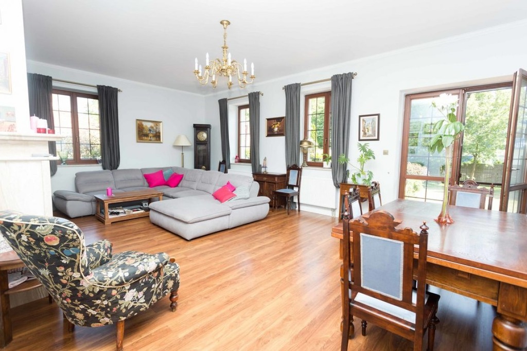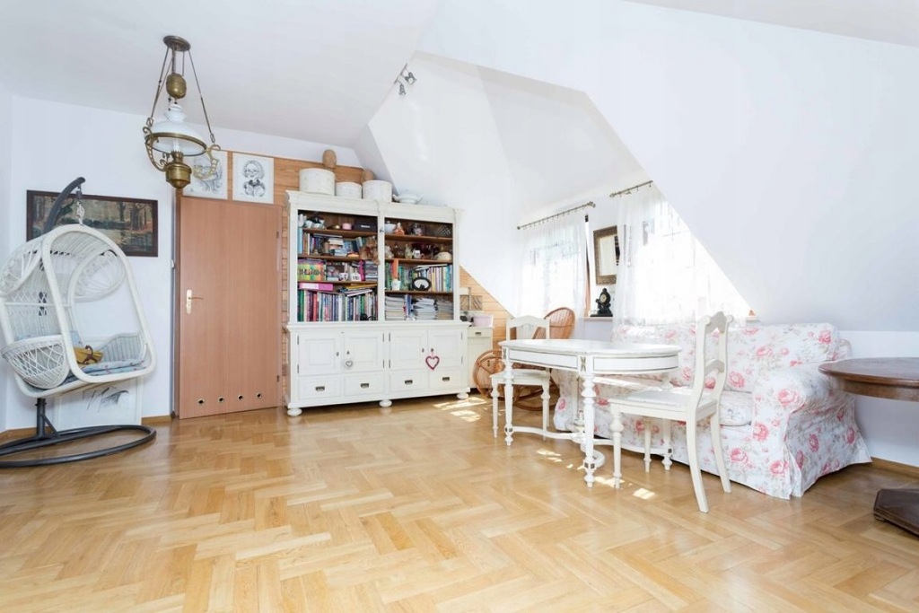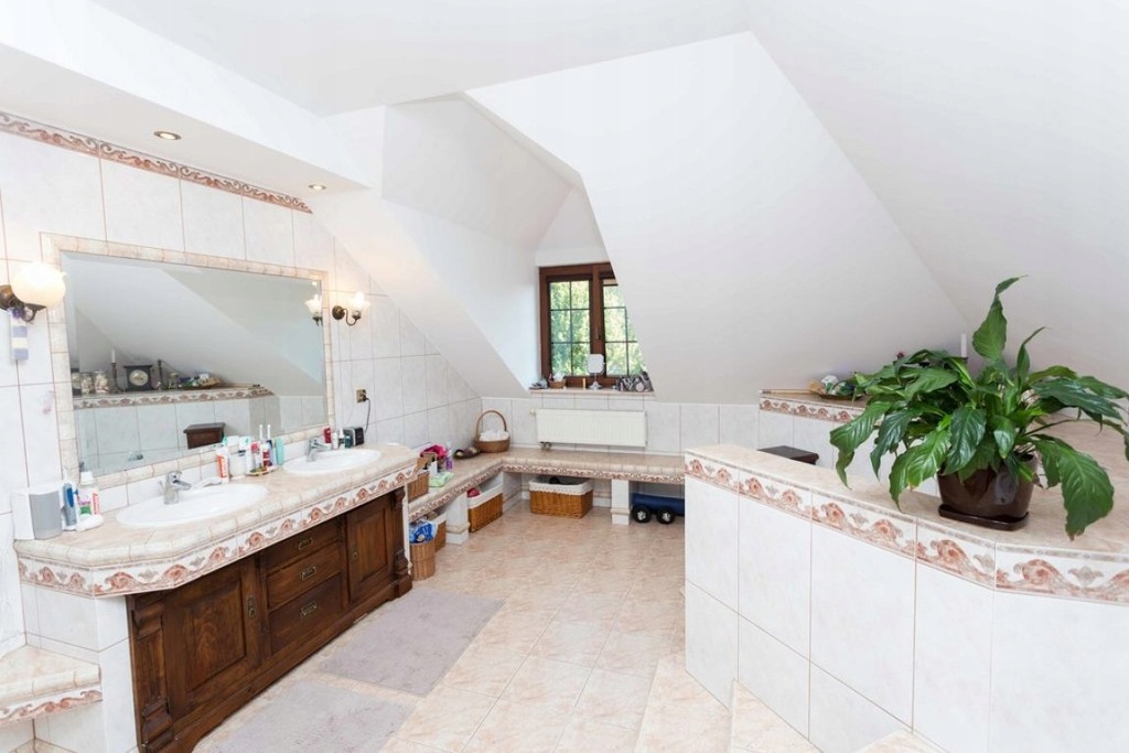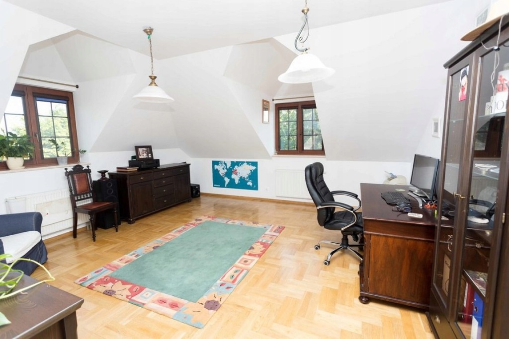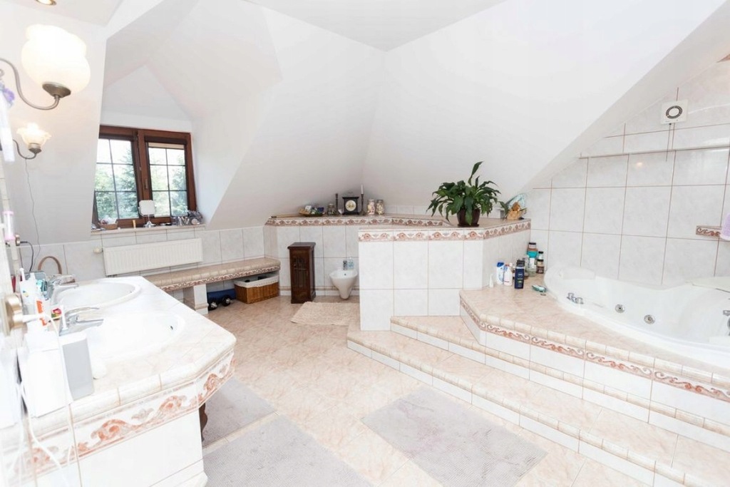 Dom ma 7 pokoi, 4 łazienki, osobną kuchnię, spiżarnię, garderobę, pralnię i kotłownię, do tego saunę i piwniczkę.
