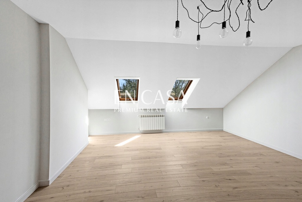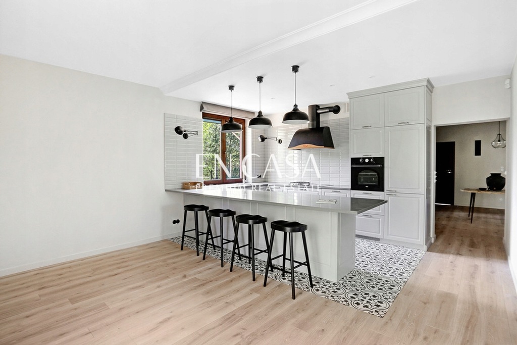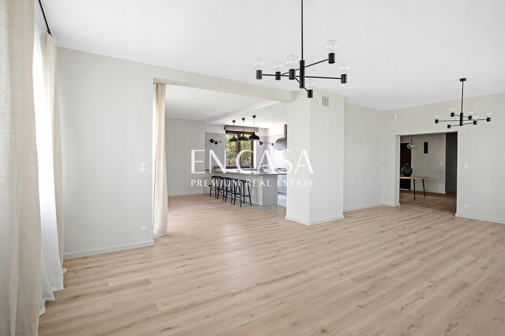 A spacious house in a modern cottage style, newly renovated, with an area of 380 m2, plot 2,037 m2. Five bedrooms with the possibility of a sixth, a huge natural garden and two terraces.