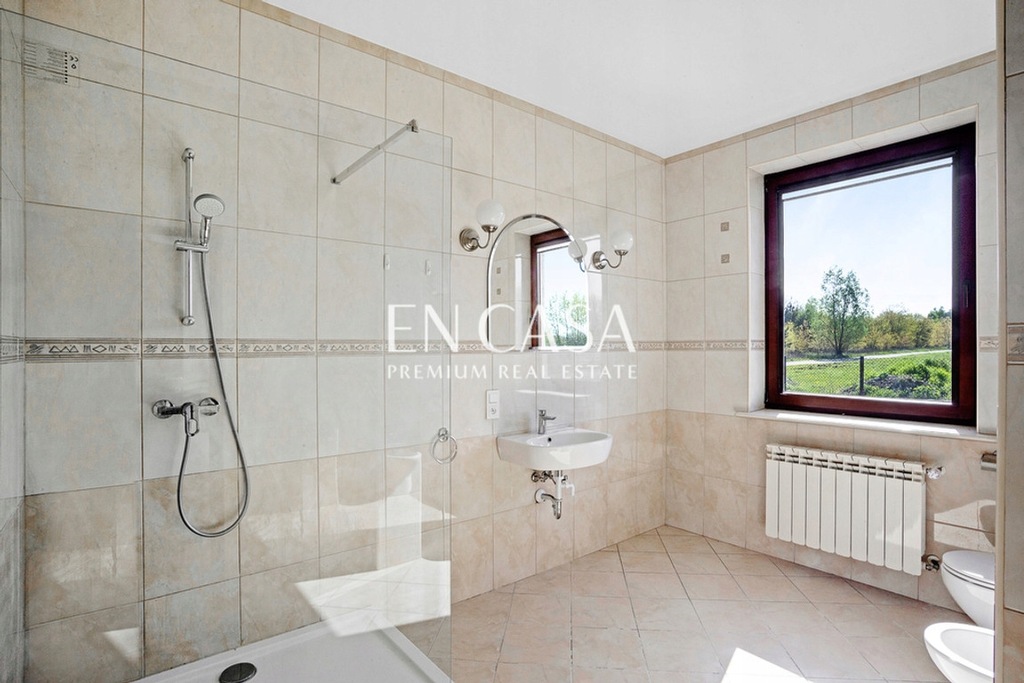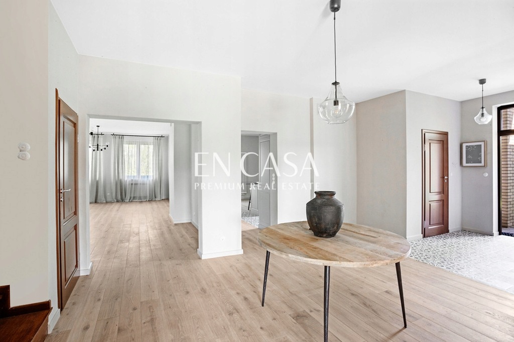 A detached house ( in Jesówka) ideal for people looking for large space and a functional interior. Very large living space, a large number of rooms, completely renovated interiors, beautiful modern kitchen and bathroom furniture. High standard of finishing: wooden floors, stone countertops, bathroom tiles from limited collections. A natural garden with small old trees and conifers. This is an ideal offer for demanding customers looking for a property that will provide them with comfort and a sense of intimacy. Its layout allows you to separate the private part of the house from the office.