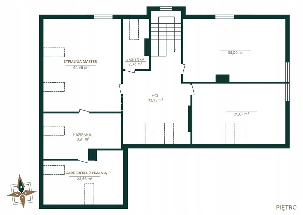 Master suite o powierzchni 44 m2 pozwoli na aranżację części sypialnej i części wypoczynkowej. Ma własną łazienkę (prysznic, wanna, umywalka, bidet, WC) i garderobę.