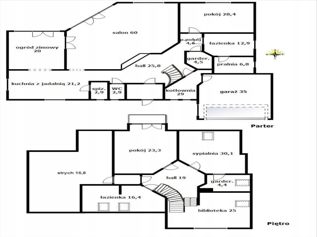 Nieruchomość złożona z: • salon 60 m.kw• pokój 28,4 m.kw• kuchnia z jadalnią 21,2 m.kw• łazienka 12,9 m.kw• pralnia 6,8 m.kw• garderoba 4,5 m.kw• ogród zimowy 20 m.kw• hall 25,8 m.kw• przedpokój 4,6 m.kw• wc 2,9 m.kw• spiżarnia 2,9 m.kw• kotłownia 29 m.kw• sypialnia 30,1 m.kw• pokój 23,3 m.kw• biblioteka 25 m.kw• garderoba 4,4 m.kw• łazienka główna 16,4 m.kw• hall 19 m.kw