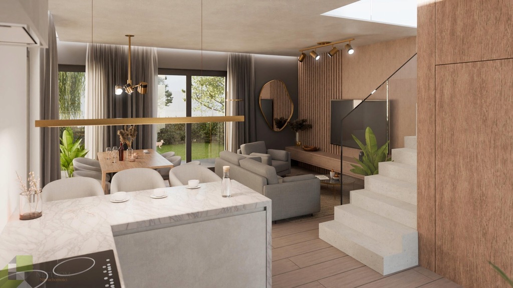 Dom w stanie deweloperskim. Wysoki standard. Klimatyzacja, rekuperacja, ogrzewanie podłogowe, pompa ciepła i przygotowanie do montażu fotowoltaiki. Atrakcyjny wygląd i położenie wśród drzew. Płaski dach nadaje nowoczesny wygląd i pozwala w pełni wykorzystać powierzchnię piętra.