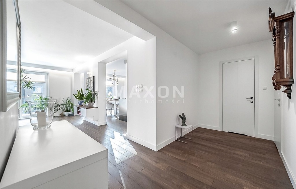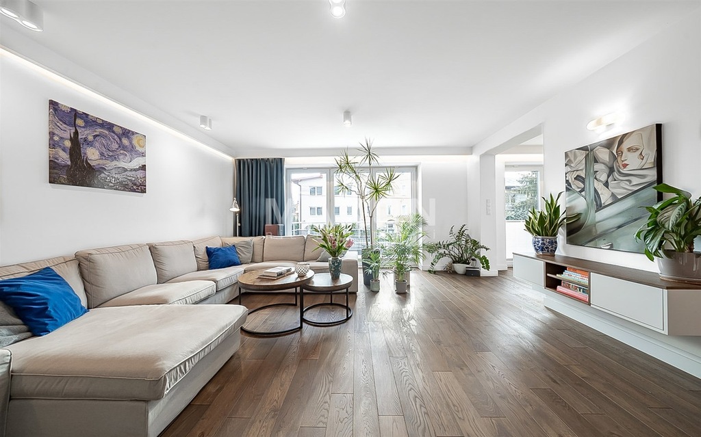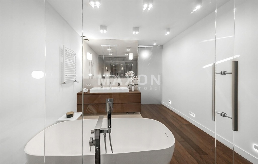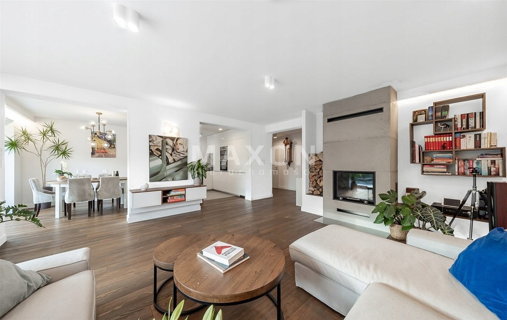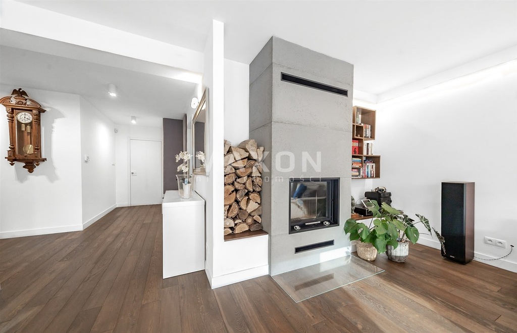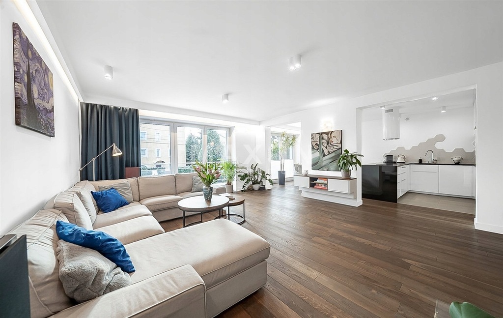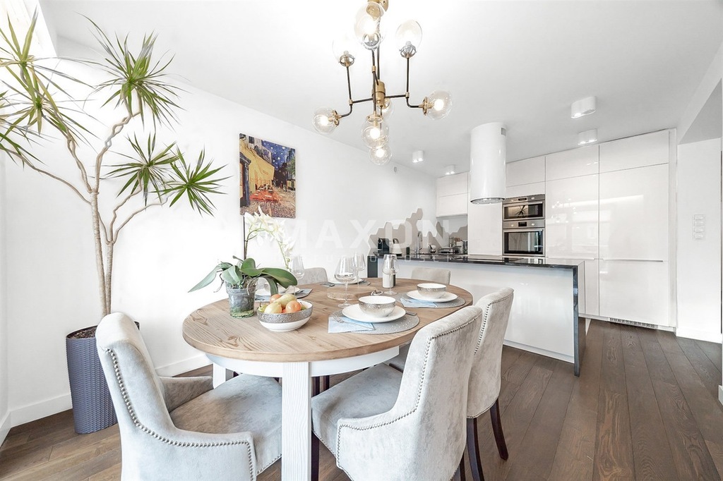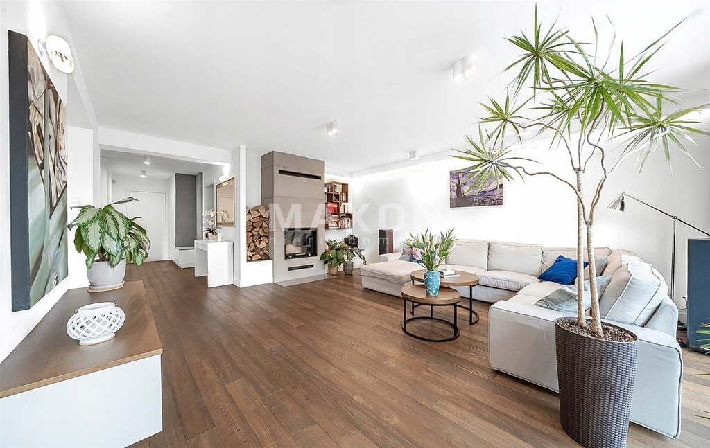 Na dwóch poziomach (parter, piętro, każde po ok. 90 mkw.) znajduje się 5 pokoi: dwa salony (29 mkw., 29 mkw.) i trzy sypialnie, kuchnia z jadalnią, dwie łazienki, dwie niezależne toalety i garderoba.