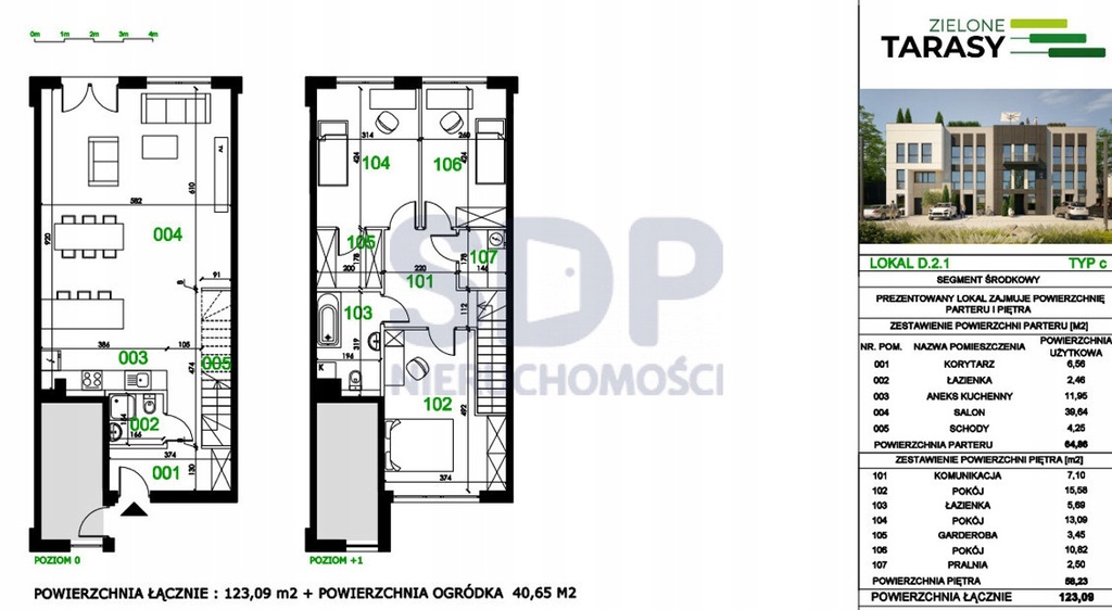 Segment środkowy o powierzchni 123 m2 z ogródkiem o powierzchni 40 m2.