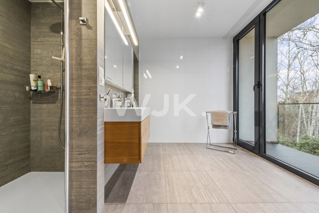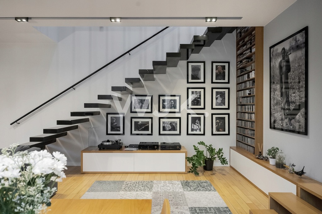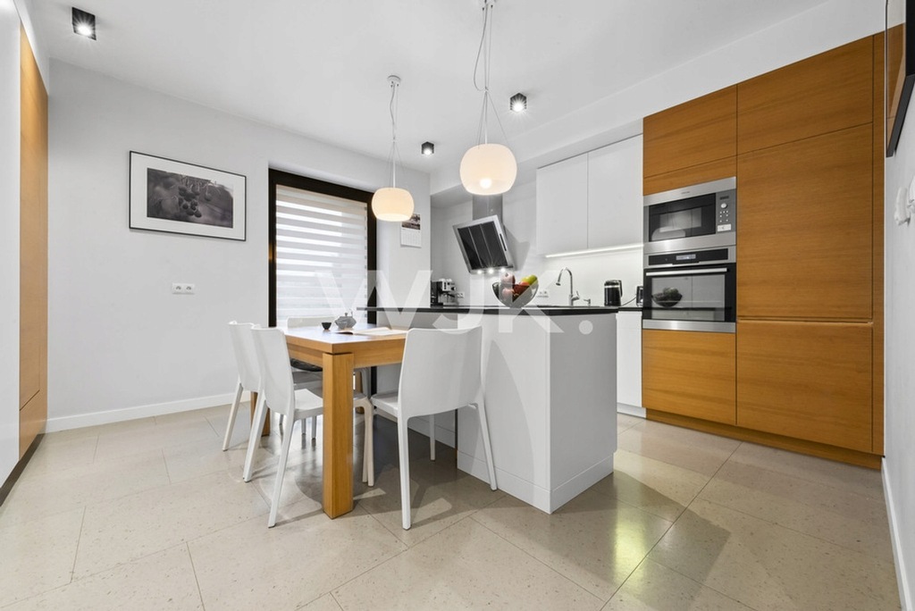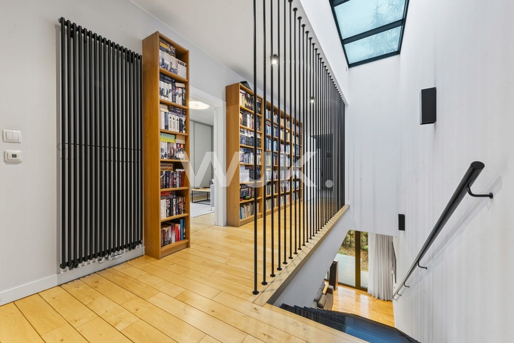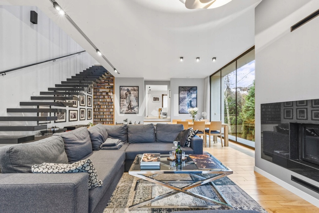 The house is finished with high-quality materials. The interior design and finishing were carried out by the renowned architectural studio FOROOM. The living room, a representative part of the house, features granite cantilever stairs and oak flooring. The space is illuminated by an impressive ceiling skylight with southern and eastern exposure.