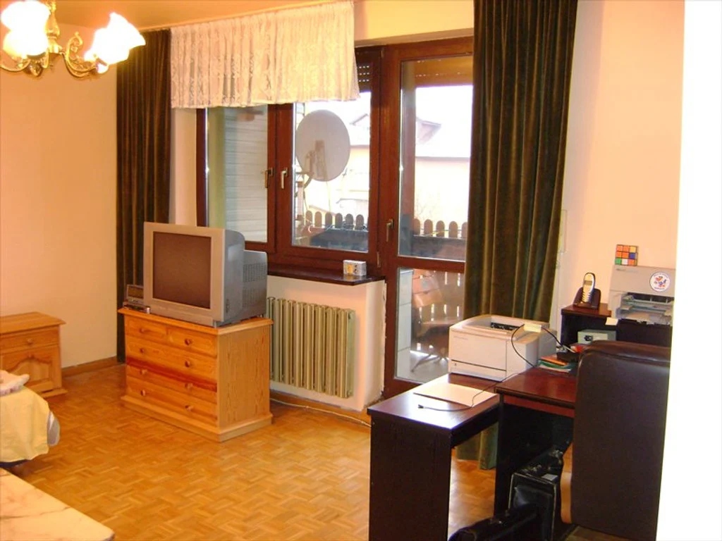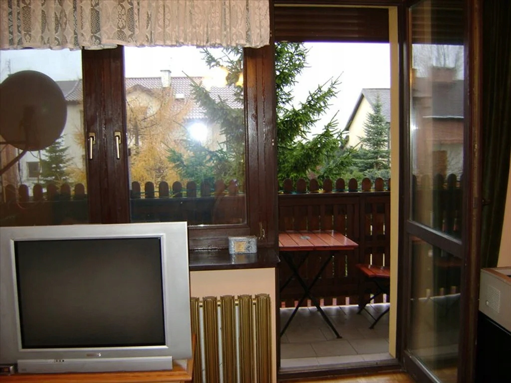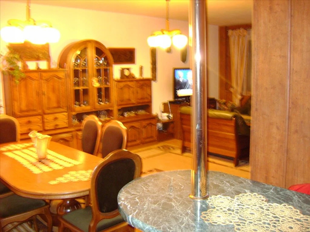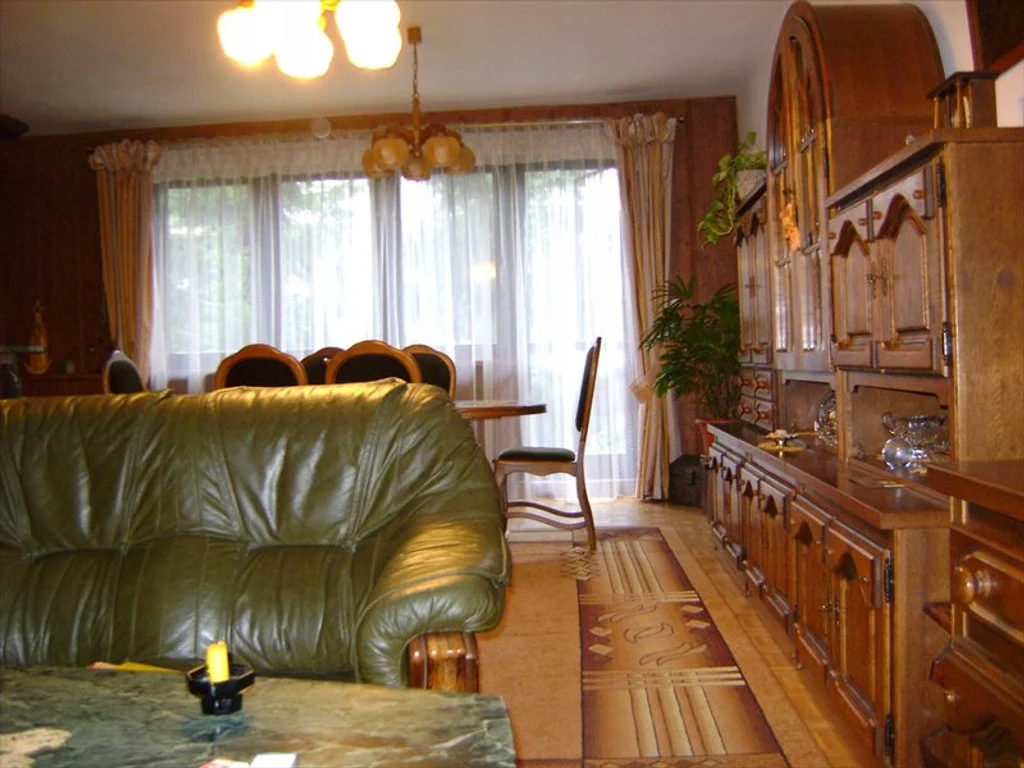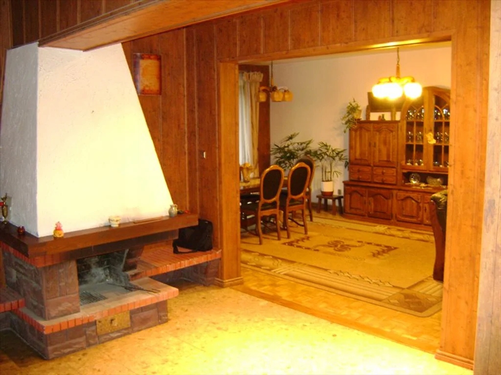 Salon (wysokość 280cm)38m2 połączony z holem 17m2, kominek, wnęka z barkiem, wyjście na patio. Podłoga mozaika dębowa, ściany gładź i szeroki panel dąb rustic. W holu na podłodze terakota, ściany wykładane panelami jw. Osobna widna kuchnia 12m2.,(możliwość połączenia z salonem), ściany boazeria w dobrym stanie oraz glazura, podłoga terakota, zabudowa pozostaje. Łazienka (kabina prysznicowa, umywalka, WC) 3,5m2, glazura, terakota.