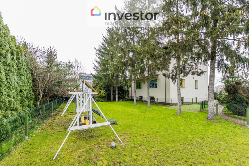 Działka ogrodzona z pięknymi nasadzeniami i placem zabaw.