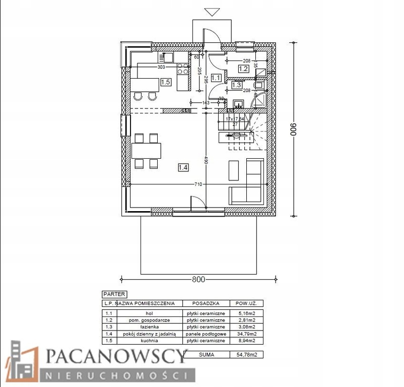 Parter: hol (5,16m2), pom. gospodarcze (2,81m2), łazienka (3,08m2), salon + jadalnia (34,79m2), kuchnia (8,94m2) - razem 54,78m2