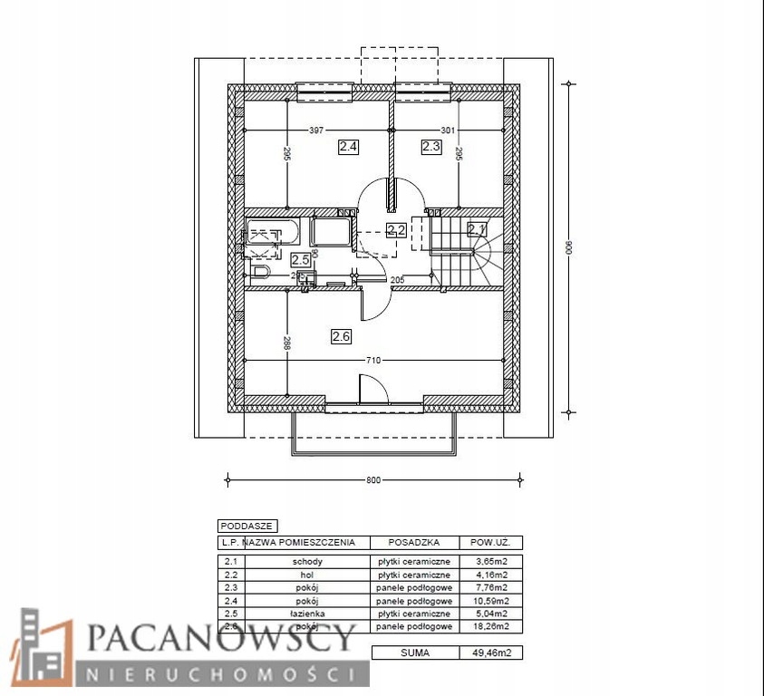 Poddasze: schody (3,65m2), hol(4,16m2), pokój (7,76m2), pokój (10,59m2), łazienka (5,04m2), pokój (18,26m2) - razem 49,46m2