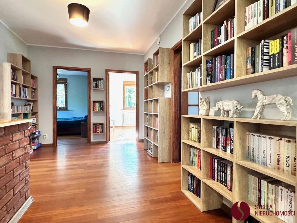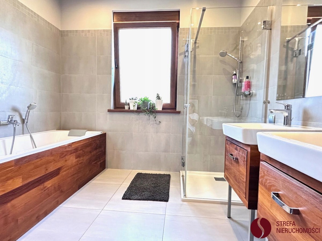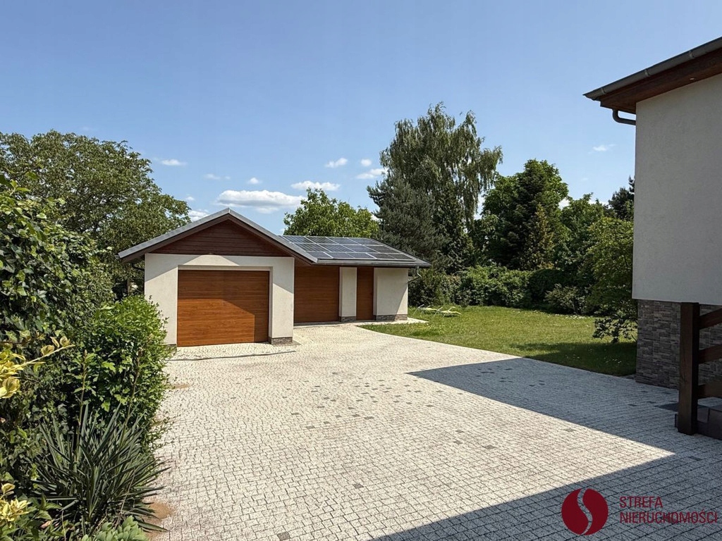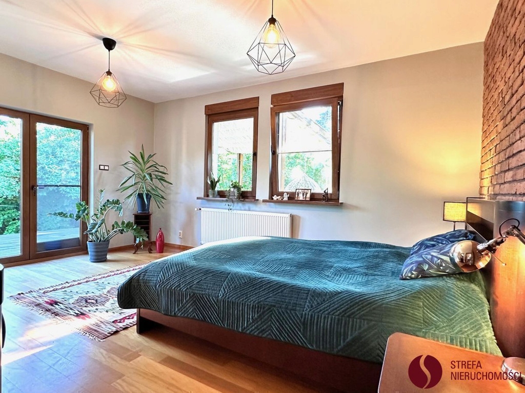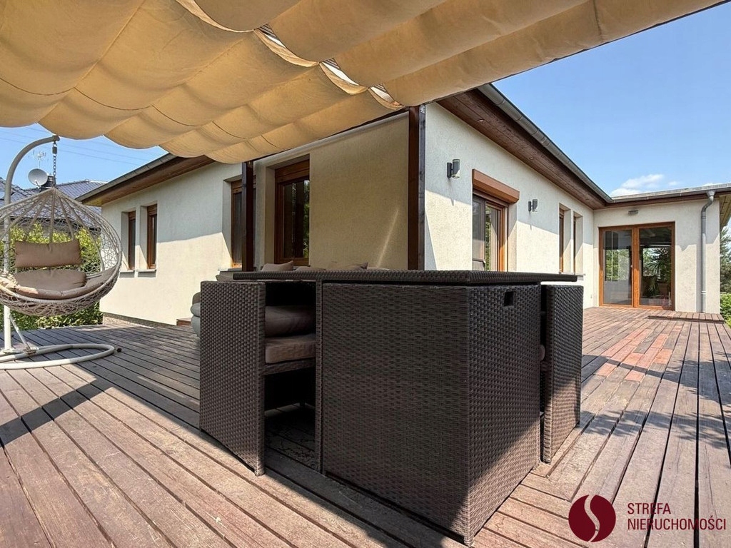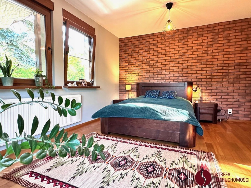STANDARD WYKOŃCZENIA: Wnętrze domu zachwyci nawet najbardziej wymagających klientów. Parterowy budynek, wolnostojący, funkcjonalny rozkład pomieszczeń, staranne i gustownie wykończone pomieszczenia oraz lokalizacja w sąsiedztwie lasu i zabudowy jednorodzinnej, to niewątpliwie najważniejsze atuty tej nieruchomości. Dzięki sporej ilości przeszkleniom w salonie i jadalni do wnętrza wpada sporo światła dziennego. Okna PCV z roletami zewnętrznym z pełną automatyką, z moskitierami, wystawa salonu i tarasu skierowana jest na słoneczną stronę świata, tj. południowy-zachód. Za oknami widok na ogrodową zieleń. Na podłogach w większości pomieszczeń położono jednolitego koloru drewno egzotyczne. Ogrzewanie i ciepłą woda z nowoczesnego, 2-funkcyjnego pieca gazowego (roczne koszty ok. 5200 zł), dodatkowo jest kominek (przygotowany pod płaszcz wodny),fotowoltaika (5,1 kWp, net metering). Wszystkie pomieszczenia znajdują się na jednym poziomie oprócz piwnicy gdzie jest pralnia (z miejscem na pralkę, suszarkę, zmiękczacz wody i miejsce na przechowywanie) oraz dodatkowy pokój, w którym można postawić np. stół bilardowy, czy stół do ping-ponga. Kuchnia zabudowana jest szafkami na wymiar wraz z dużym AGD i stołem z 4 krzesłami. Z kuchni przesuwnymi drzwiami wychodzimy wprost na jadalnię z dużo większym, gościnnym stołem, dalej jest salon z kominkiem, częścią wypoczynkową i wyjściem na taras. Trzy przestronne i jasne sypialnie, jedna z garderobą a dwie ze sporych rozmiarów szafami na ubrania, czwarty pokój jest trochę mniejszy ale spełni funkcję pokoju gościnnego albo kolejnej sypialni, piąty pokój, to mały gabinet albo garderoba. W większej łazience jest duża wanna, kabina prysznicowa z niskim brodzikiem, dwie umywalki, miska ustępowa i bidet, w mniejszej - prysznic, umywalka i miska ustępowa. Wszystkie pomieszczenia łączy obszerny hol z regałami gdzie można przechowywać książki z domowej biblioteki.