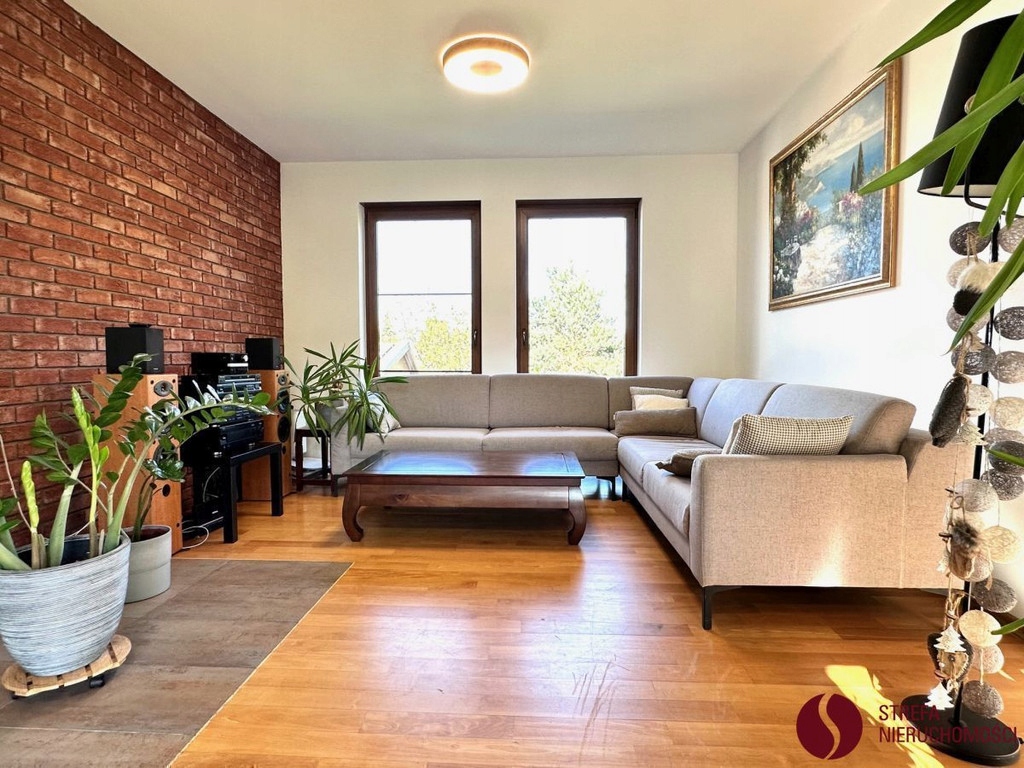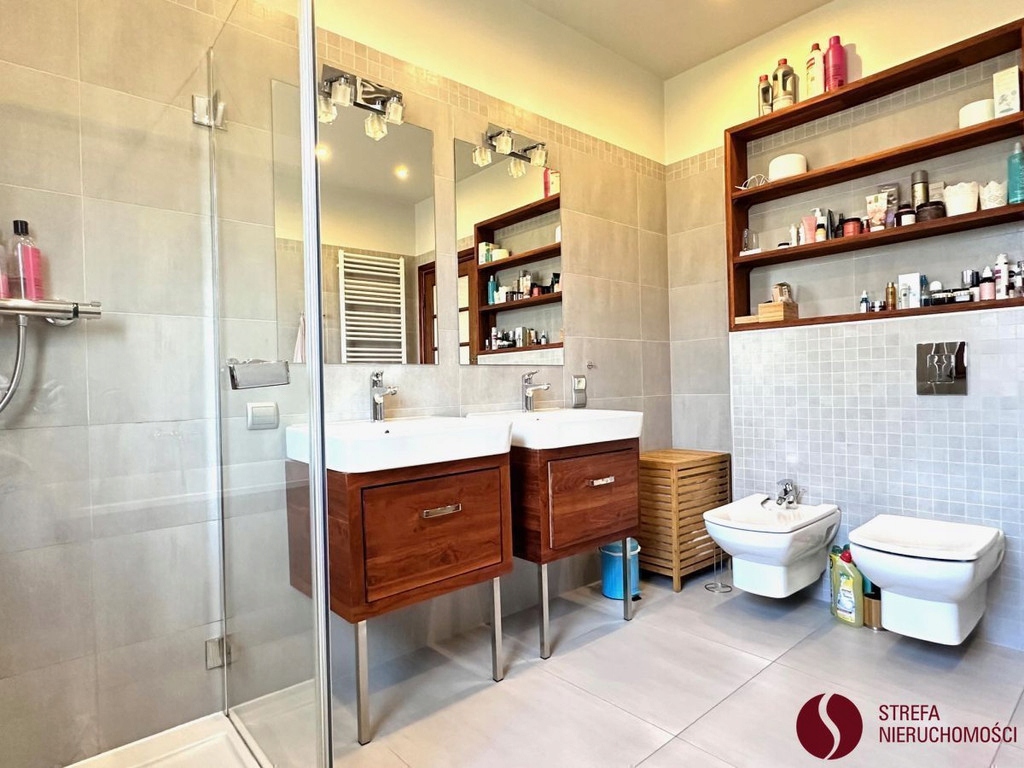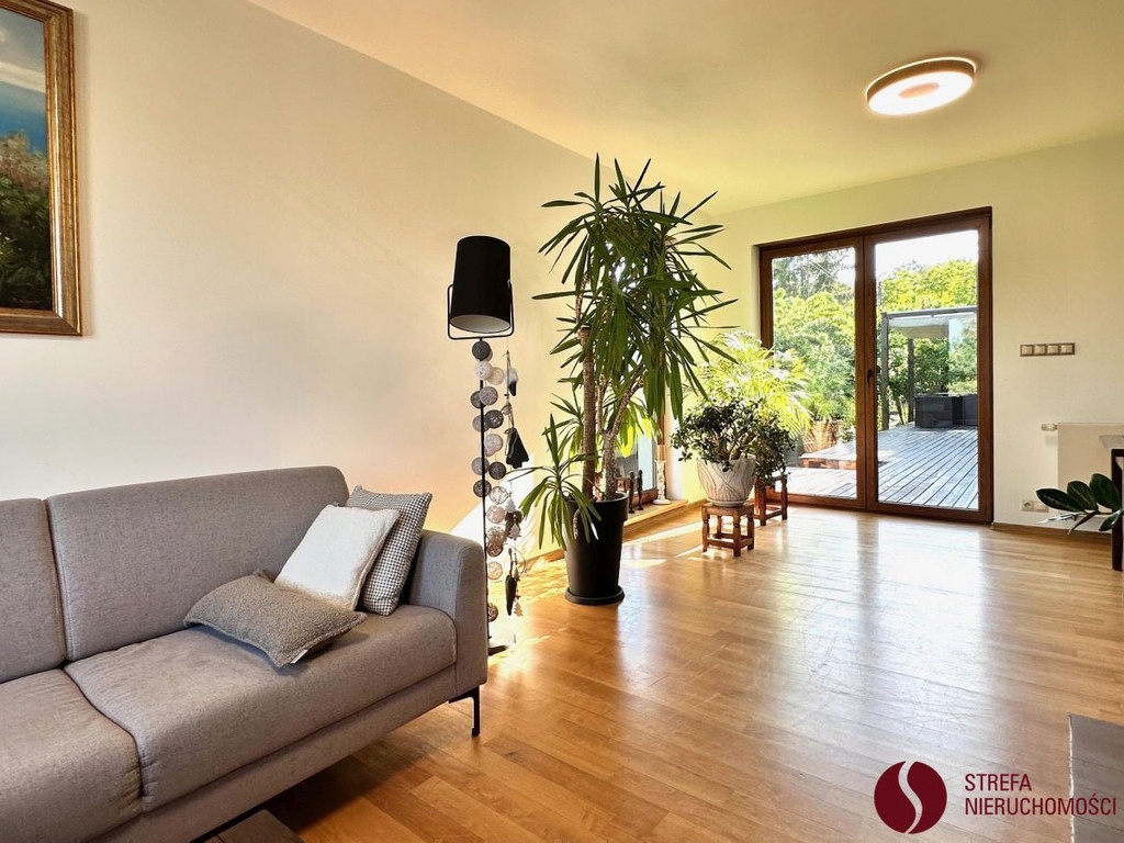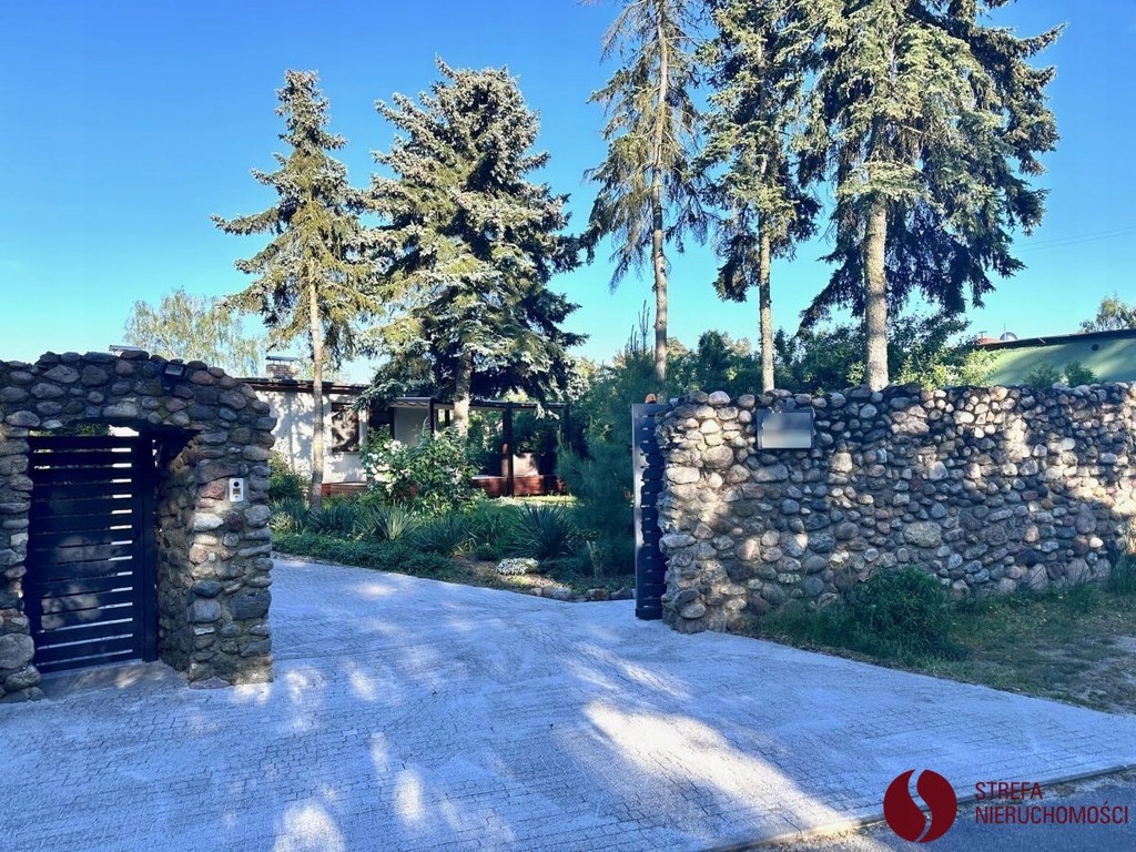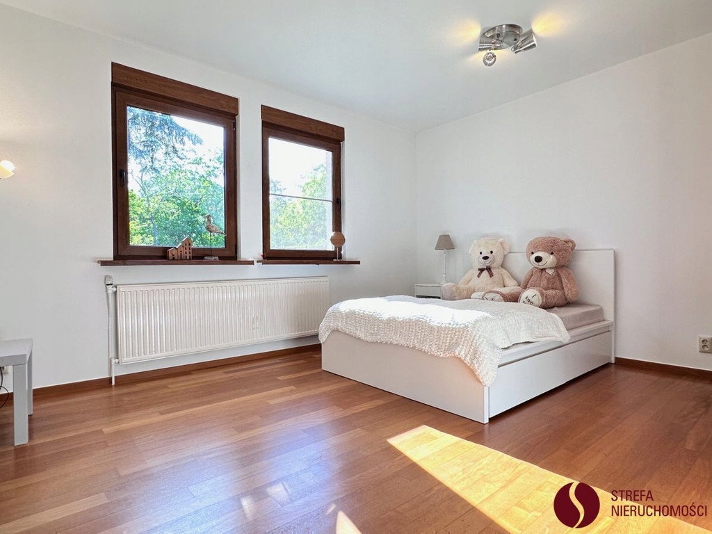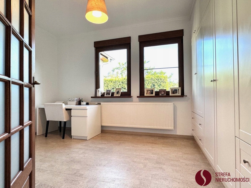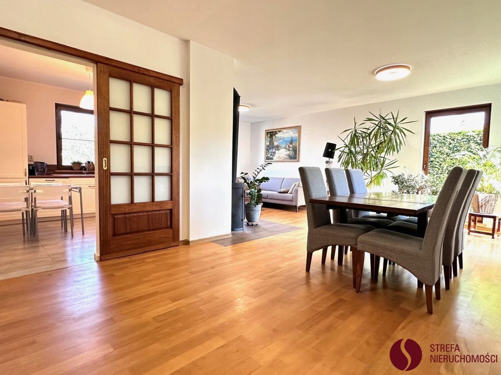 STANDARD WYKOŃCZENIA: Wnętrze domu zachwyci nawet najbardziej wymagających klientów. Parterowy budynek, wolnostojący, funkcjonalny rozkład pomieszczeń, staranne i gustownie wykończone pomieszczenia oraz lokalizacja w sąsiedztwie lasu i zabudowy jednorodzinnej, to niewątpliwie najważniejsze atuty tej nieruchomości. Dzięki sporej ilości przeszkleniom w salonie i jadalni do wnętrza wpada sporo światła dziennego. Okna PCV z roletami zewnętrznym z pełną automatyką, z moskitierami, wystawa salonu i tarasu skierowana jest na słoneczną stronę świata, tj. południowy-zachód. Za oknami widok na ogrodową zieleń. Na podłogach w większości pomieszczeń położono jednolitego koloru drewno egzotyczne. Ogrzewanie i ciepłą woda z nowoczesnego, 2-funkcyjnego pieca gazowego (roczne koszty ok. 5200 zł), dodatkowo jest kominek (przygotowany pod płaszcz wodny),fotowoltaika (5,1 kWp, net metering). Wszystkie pomieszczenia znajdują się na jednym poziomie oprócz piwnicy gdzie jest pralnia (z miejscem na pralkę, suszarkę, zmiękczacz wody i miejsce na przechowywanie) oraz dodatkowy pokój, w którym można postawić np. stół bilardowy, czy stół do ping-ponga. Kuchnia zabudowana jest szafkami na wymiar wraz z dużym AGD i stołem z 4 krzesłami. Z kuchni przesuwnymi drzwiami wychodzimy wprost na jadalnię z dużo większym, gościnnym stołem, dalej jest salon z kominkiem, częścią wypoczynkową i wyjściem na taras. Trzy przestronne i jasne sypialnie, jedna z garderobą a dwie ze sporych rozmiarów szafami na ubrania, czwarty pokój jest trochę mniejszy ale spełni funkcję pokoju gościnnego albo kolejnej sypialni, piąty pokój, to mały gabinet albo garderoba. W większej łazience jest duża wanna, kabina prysznicowa z niskim brodzikiem, dwie umywalki, miska ustępowa i bidet, w mniejszej - prysznic, umywalka i miska ustępowa. Wszystkie pomieszczenia łączy obszerny hol z regałami gdzie można przechowywać książki z domowej biblioteki.