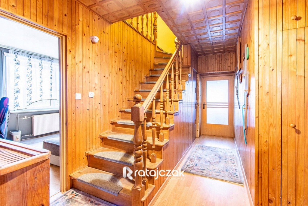 Dom wolnostojący piętrowy o łącznej powierzchni użytkowej 155 m2 wybudowany w latach 80-tych. Obecni właściciele mieszkają w domu już od kilkunastu lat i od tamtego czasu zostały wykonane prace remontowe, które wpisują się w dzisiejsze standardy. Okna zostały wymienione na PCV, wewnętrzne pomieszczenia również zostały odświeżone.