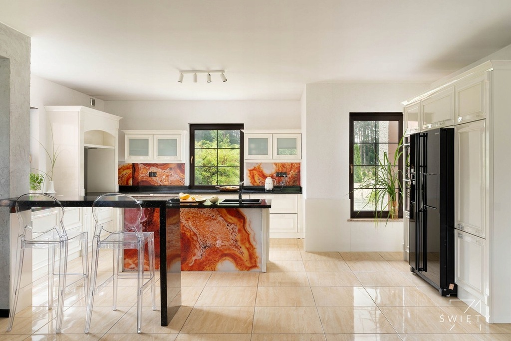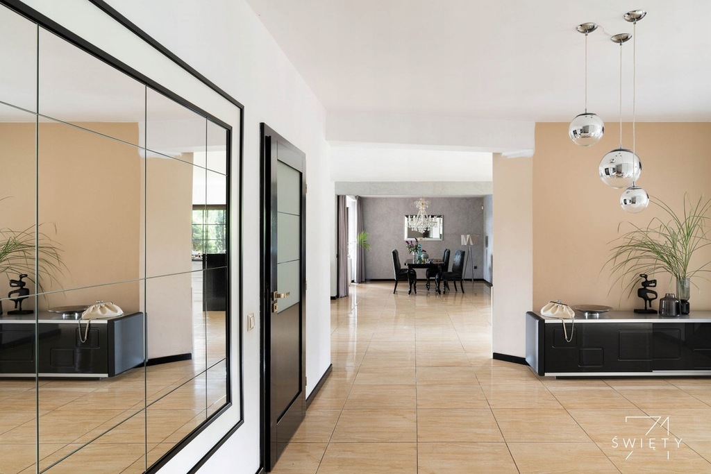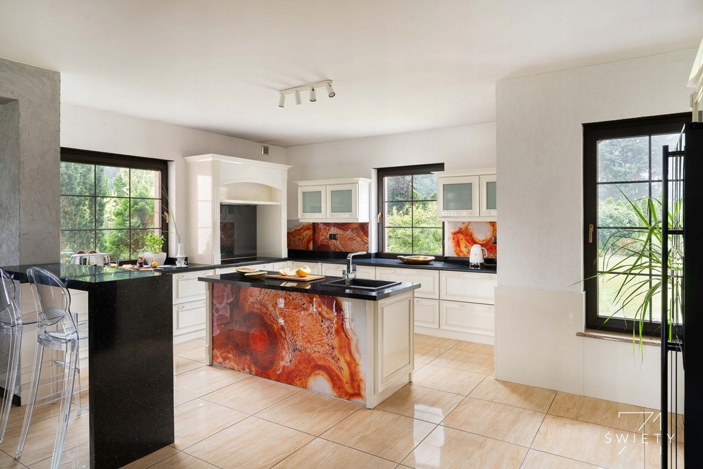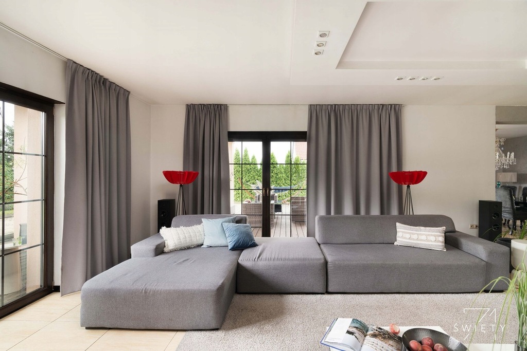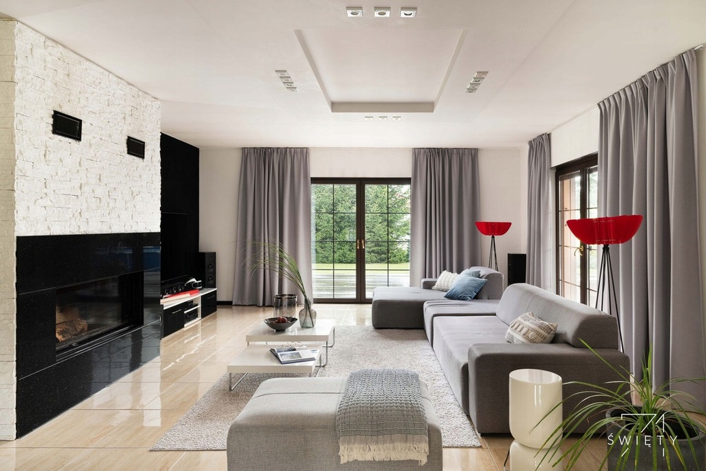• Przestronny salon z kominkiem, idealny do spędzania czasu z rodziną i przyjaciółmi