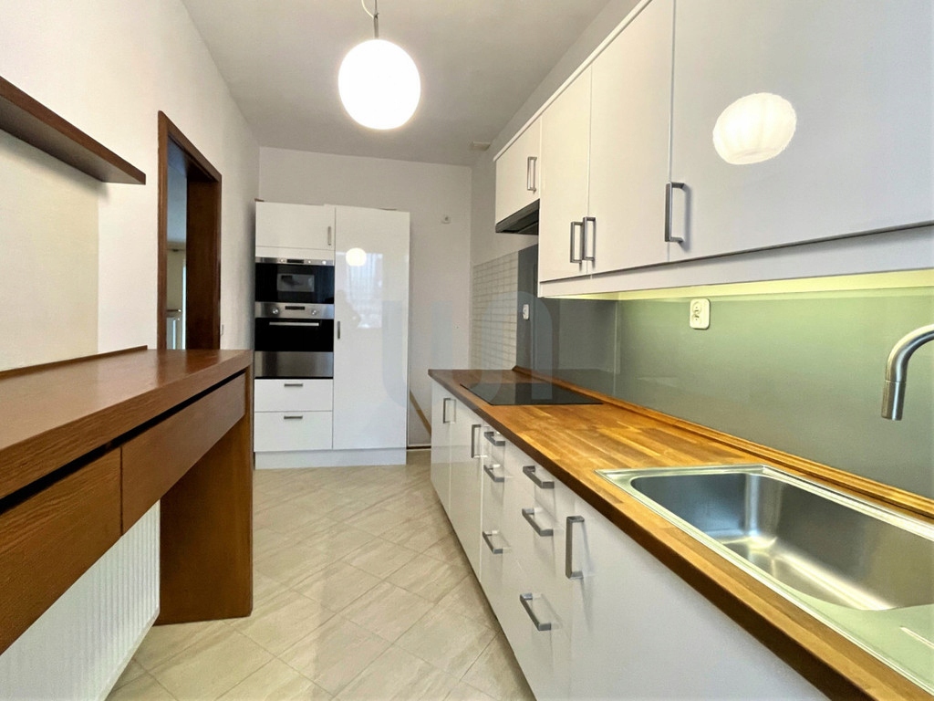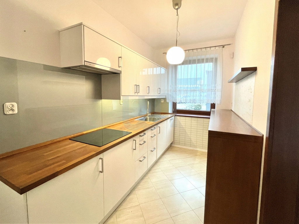 W kuchni pozostają meble w zabudowie wraz ze sprzętem AGD (zmywarka, piekarnik, okap, płyta indukcyjna, mikrofala). Blat w kuchni dębowy.