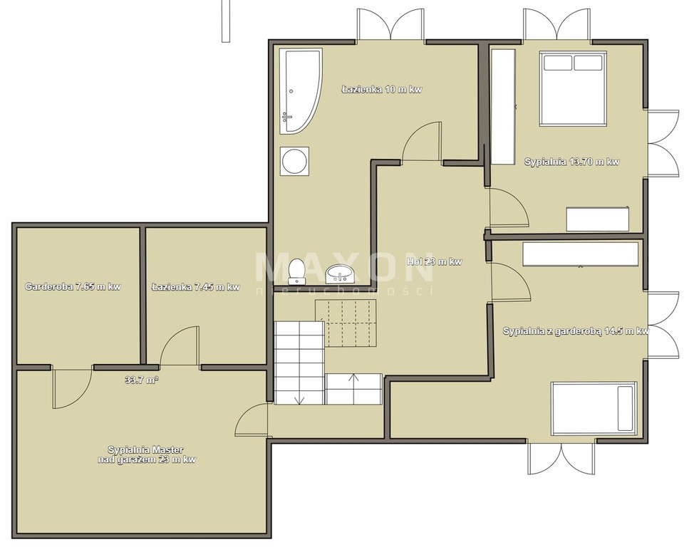 Na poziomie półpiętra mieści się sypialnia typu master (23,10 m kw.)