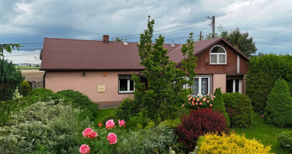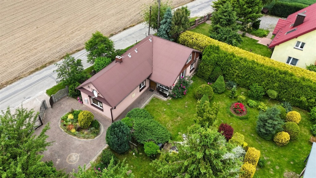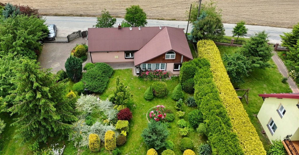 Nieruchomość obejmuje dużą, estetycznie utrzymaną działkę, na której znajduje się oczko wodne, sad, liczne krzewy, drzewa i kwiaty oraz pole, które jest obecnie dzierżawione. Całość tworzy harmonijną przestrzeń sprzyjającą wypoczynkowi.