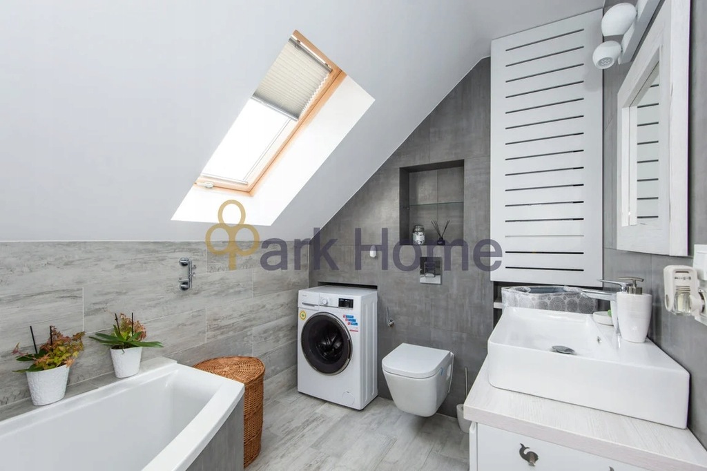 Na piętrze 3 pokoje, garderoba, duża łazienka z wanną