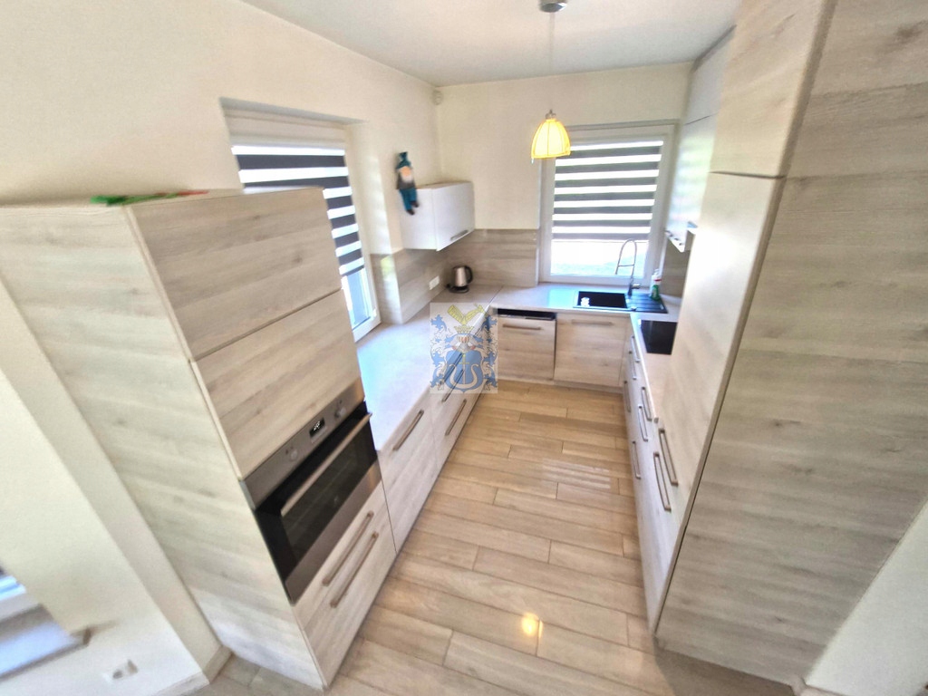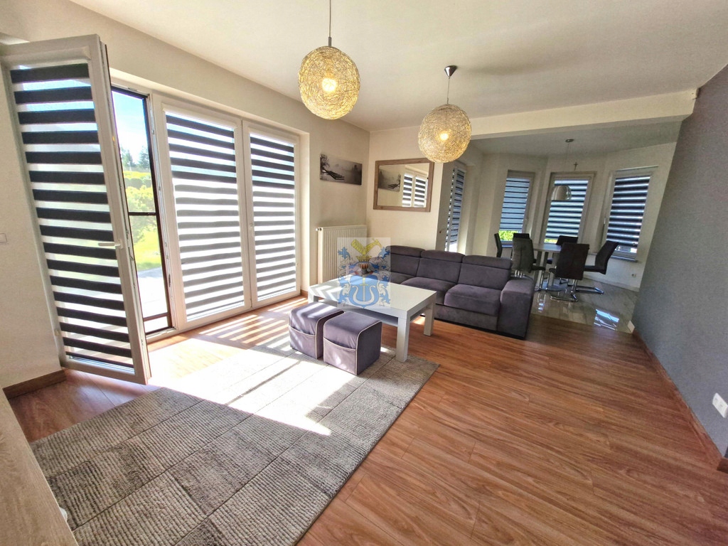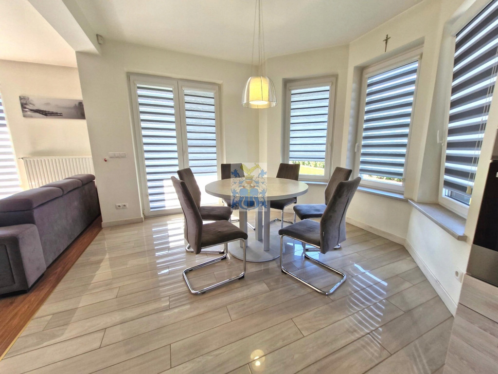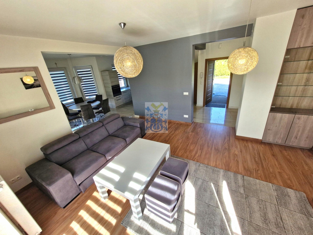 Kuchnia umeblowana i wyposażona w sprzęty AGD. W jadalni stół z krzesłami, wyjście na taras i do ogrodu. W salonie sofa, szafka RTV, stolik kawowy, drugie wyjście na taras i do ogrodu.