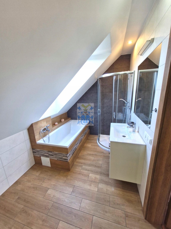 Łazienka na piętrze z wanną i prysznicem.