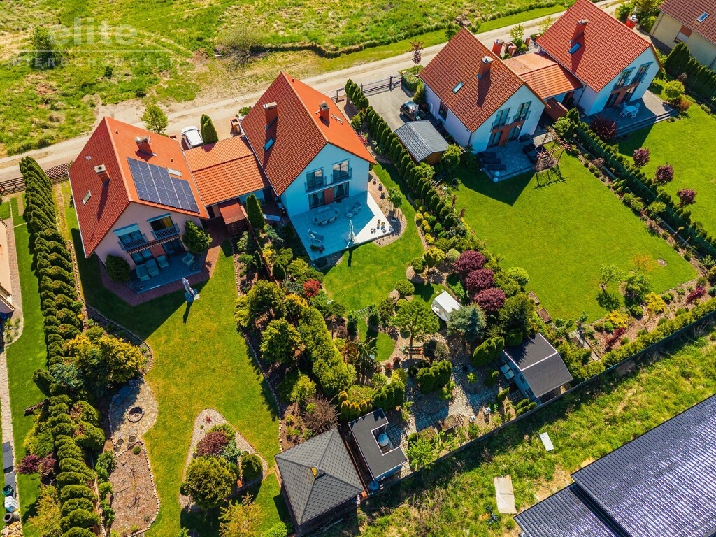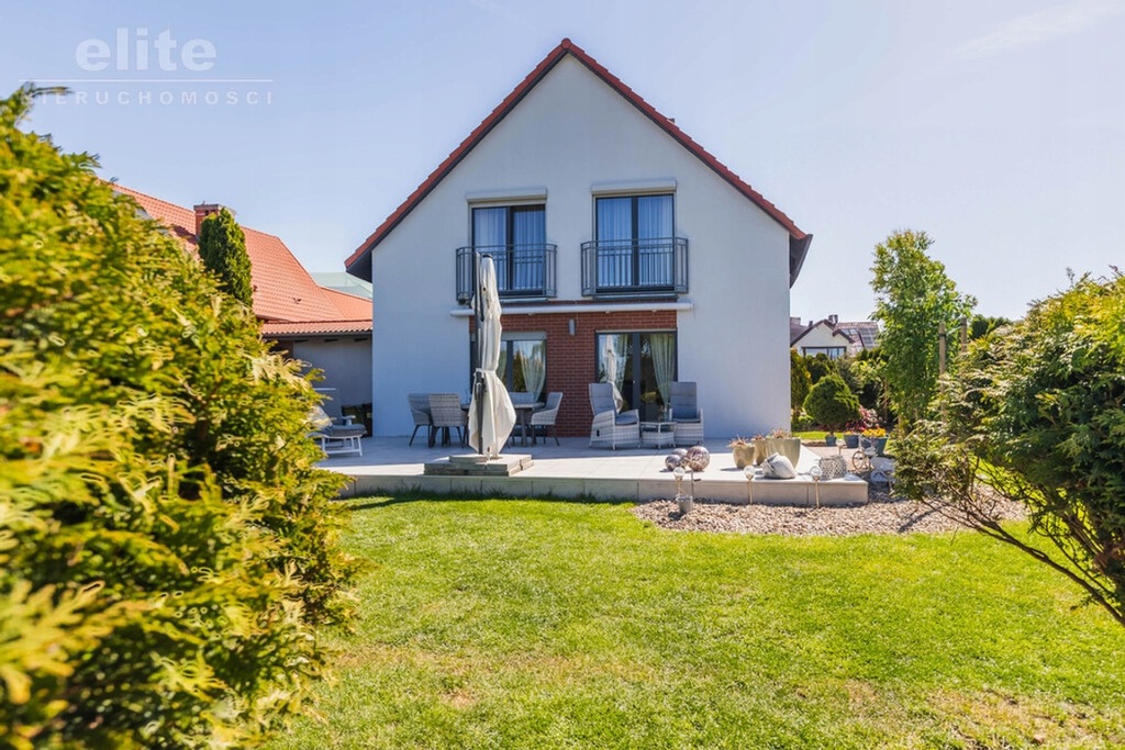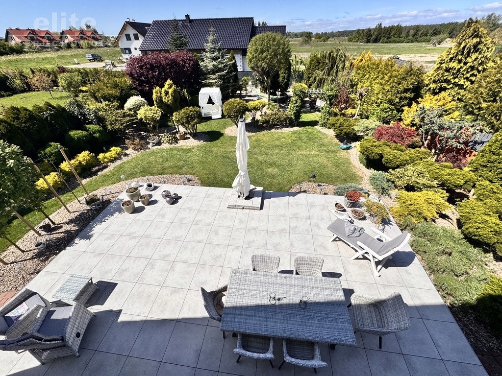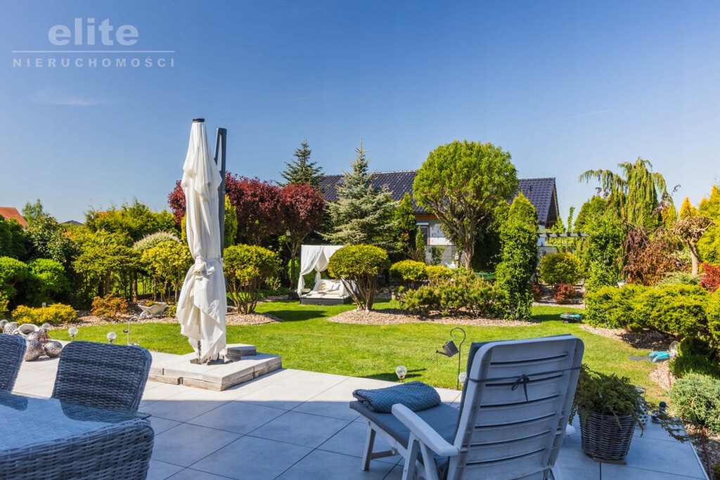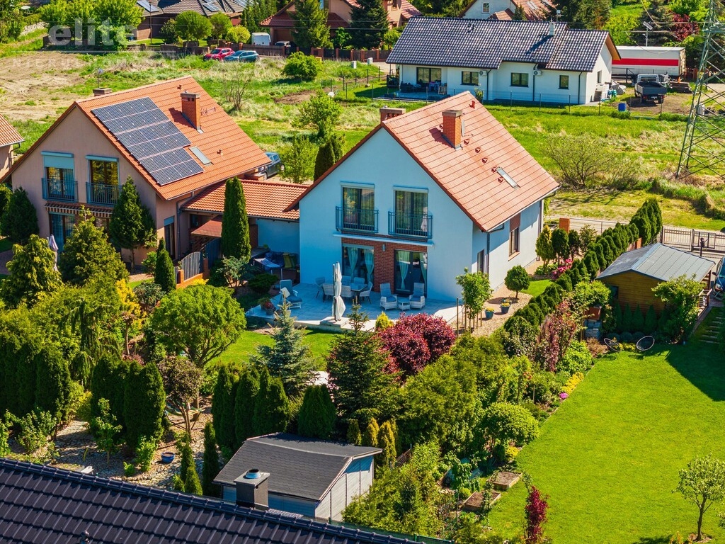 Dom (o powierzchni użytkowej ok. 157 m2/całkowitej 230 m2) posadowiony jest na pięknie zagospodarowanej w nasadzenia i roślinność działce o powierzchni ok. 700 m2). Ogród wyposażony w system ogrodowego podlewania. Duży 50 m2 taras wykonany w technologii wentylowanej a nad nim markiza sterowana na pilota. A w sezonie letnim sprawdzi się kuchnia letnia znajdująca się przy budynku.