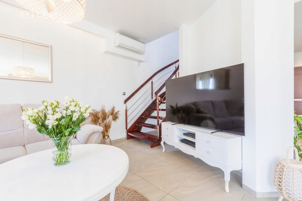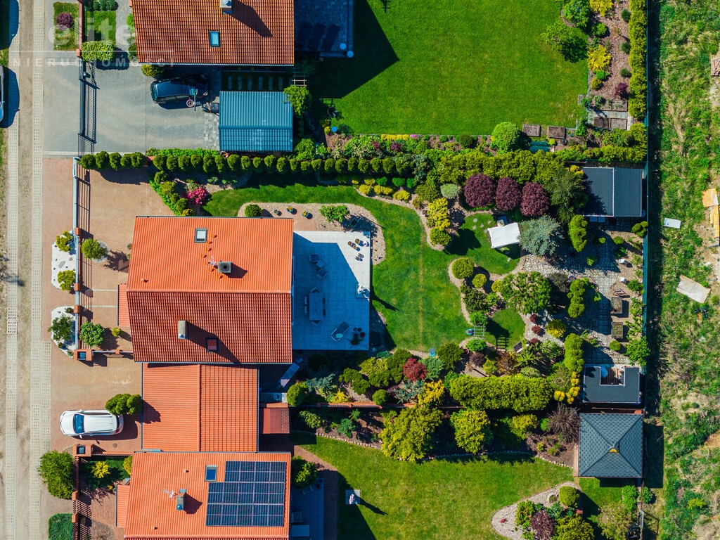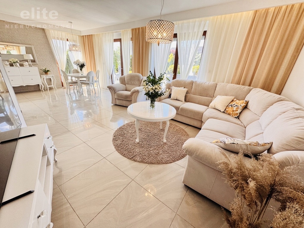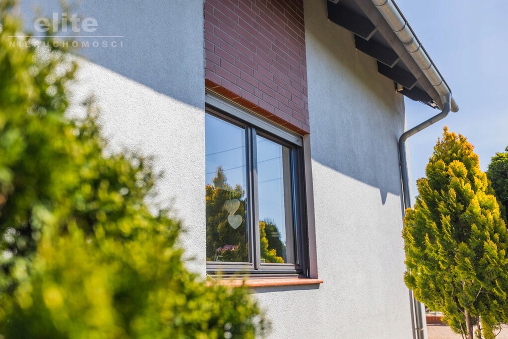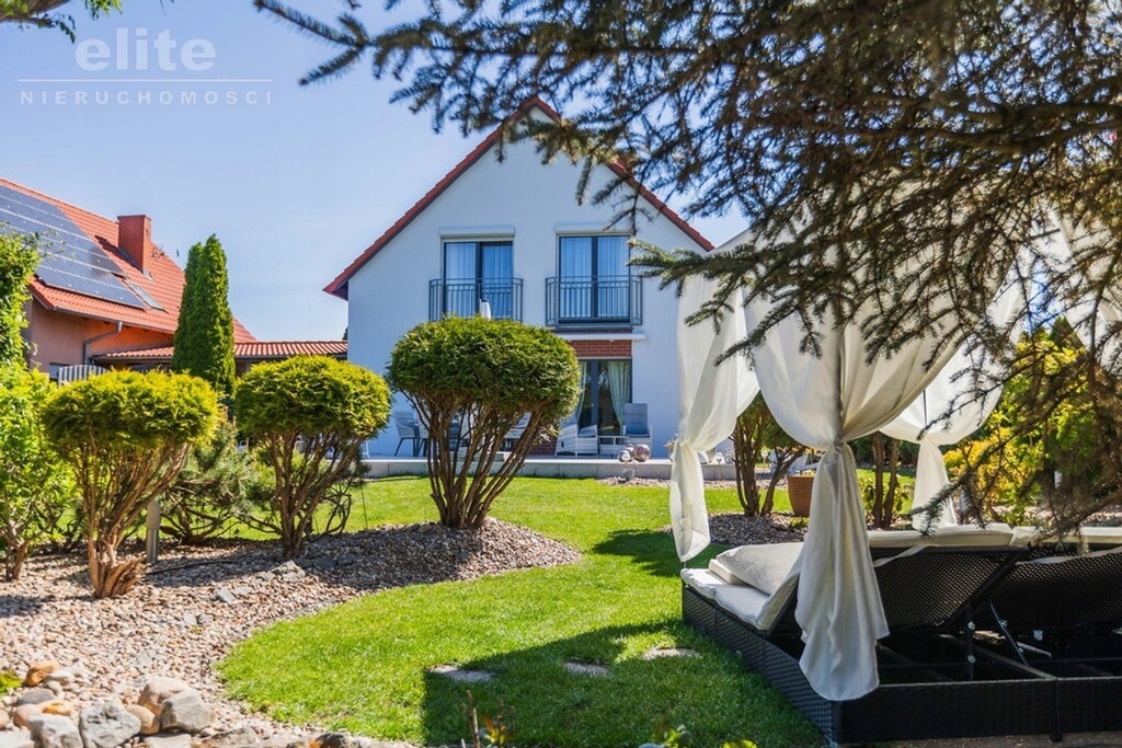Dom (o powierzchni użytkowej ok. 157 m2/całkowitej 230 m2) posadowiony jest na pięknie zagospodarowanej w nasadzenia i roślinność działce o powierzchni ok. 700 m2). Ogród wyposażony w system ogrodowego podlewania. Duży 50 m2 taras wykonany w technologii wentylowanej a nad nim markiza sterowana na pilota. A w sezonie letnim sprawdzi się kuchnia letnia znajdująca się przy budynku.