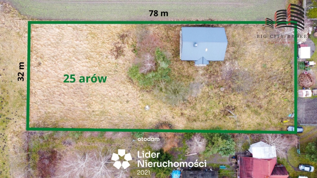 Działka zajmuje powierzchnię 2525 m². Kształt prostokąta o wymiarach 32 m x 78 m. Ogrodzona ze wszystkich stron siatką, z bramą wjazdową od frontu. Na działce znajduje się dom wolnostojący, kilka drzew, a pozostała powierzchnia stanowi świetny obszar do samodzielnego zagospodarowania wedle potrzeb nabywcy.