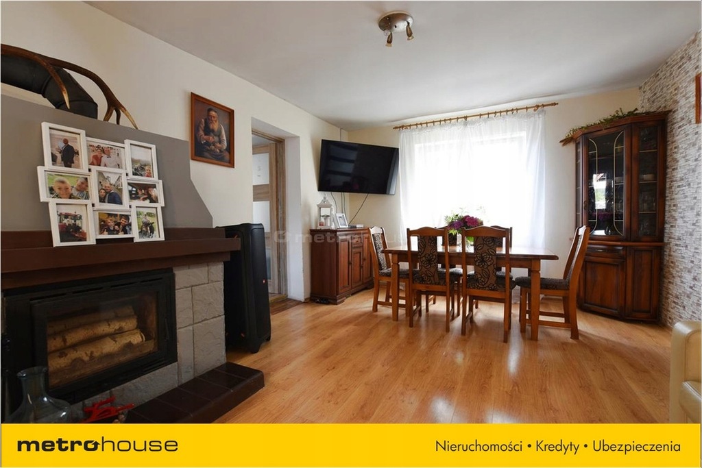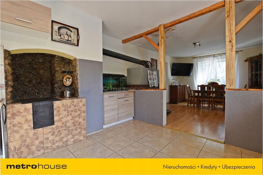 Dom składa się z czterech pokoi, salonu z kominkiem, łazienki z WC, otwartej kuchni, spiżarni oraz piwnicy.