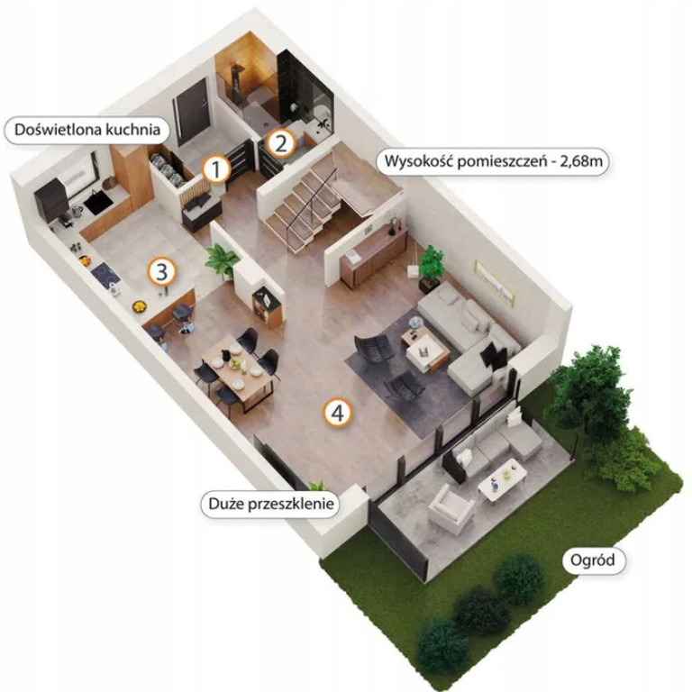 Na parterze znajduje się przestronny, prawie 40-metrowy salon z dużymi przeszkleniami i otwartą kuchnią, a także WC i wiatrołap.