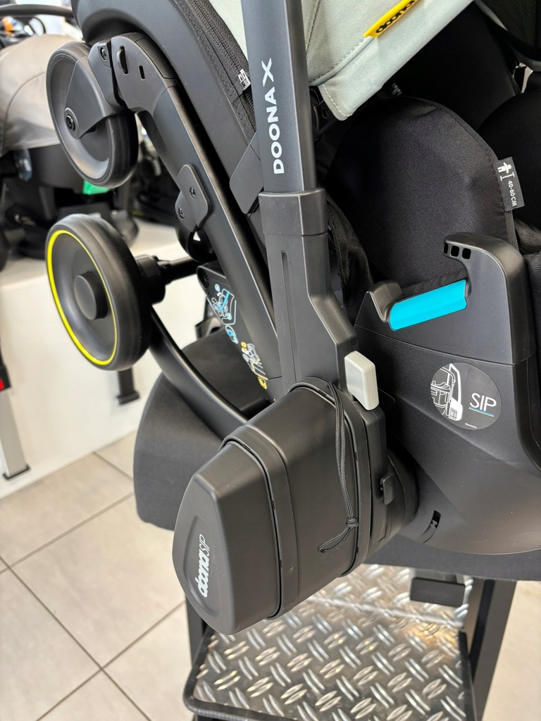 Doona X został wyposażony w system Doona SIP, który znacząco redukuje siły działające na dziecko w przypadku kolizji bocznej. Boczne elementy ochronne montowane są błyskawicznie dzięki magnetycznym złączom.