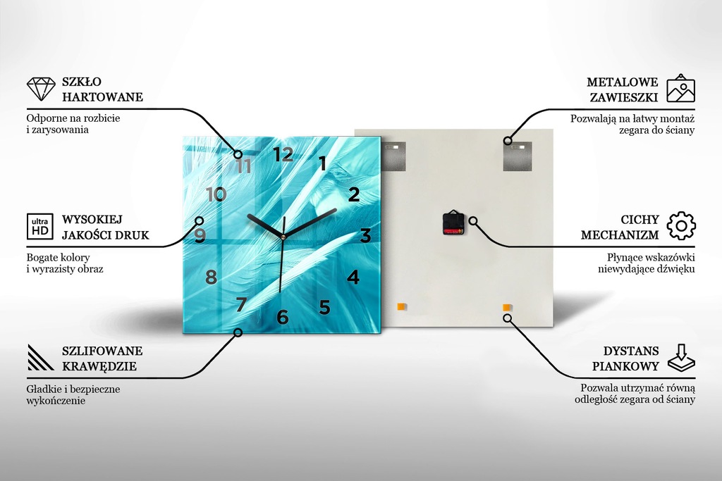 Zegary wykonywane są ze szkła hartowanego – trwałego i eleganckiego materiału, który nadaje produktowi prestiżowy wygląd i odporność na uszkodzenia.