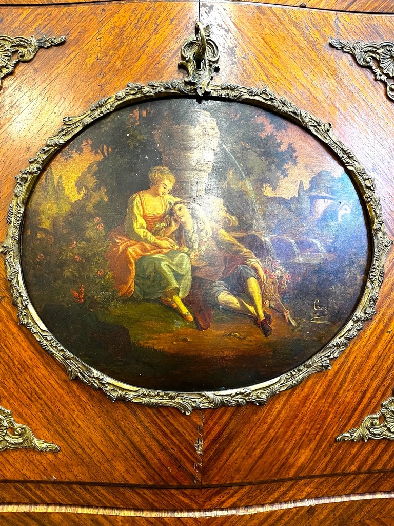 Mebel wykonany w giętej bryle. Stabilny i mocny konstrukcyjnie. Niewątpliwie zaletą mebla jest przepiękny obraz w kształcie owalnym przedstawiający parę siedzącą w leśnej scenerii pod fontanną. Całość okala piękny wianek z brązu złoconego.