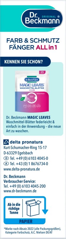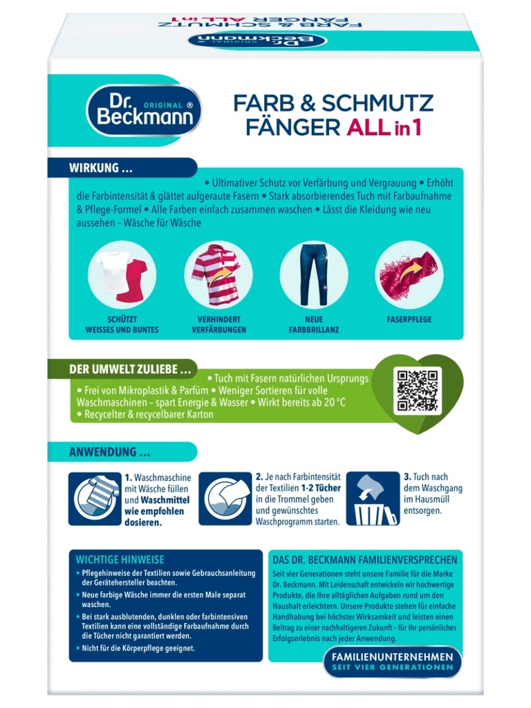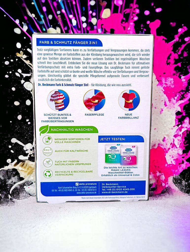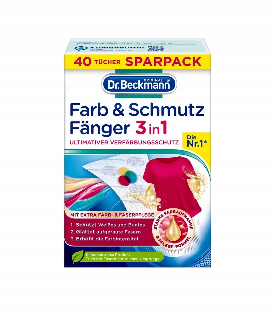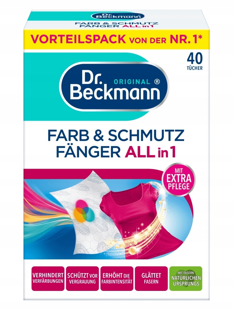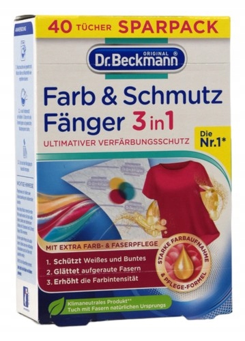 Ubrania, t-shirty i wszystkie nasze ulubione części garderoby, które wyjmujemy z pralki, powinny za każdym razem być lśniąco czyste i jak najdłużej wyglądać jak nowe. Niestety już po kilku praniach ubrania mogą stracić swój nowy wygląd i wykazywać oznaki zużycia. Nowa generacja Chusteczek wyłapujących kolor i wspomagających usuwanie brudu 3w1 marki Dr. Beckmann zapewnia najwyższą ochronę przed zafarbowaniem, a teraz także z dodatkową pielęgnację kolorów i włókien. Chłonne włókna wiążą luźne barwniki w wodzie, podczas gdy dodatkowe środki pielęgnacyjne usuwają zmechacenia i zwiększają intensywność kolorów po każdym praniu, w ten sposób przyczyniając się do zwiększenia trwałości Twoich ubrań.
