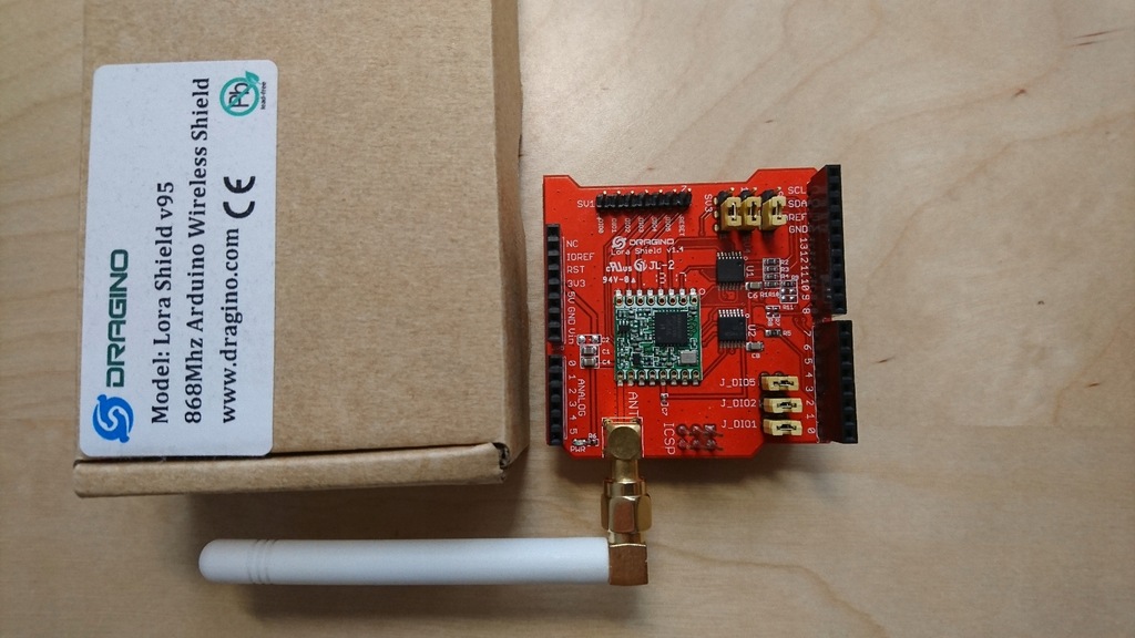 Shield używany, był zainstalowany w pomieszczeniu i używany do celów testowych (wysyła do sieci TTN kolejne liczby całkowite).