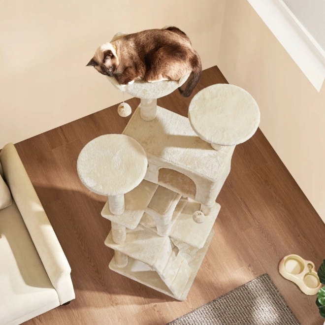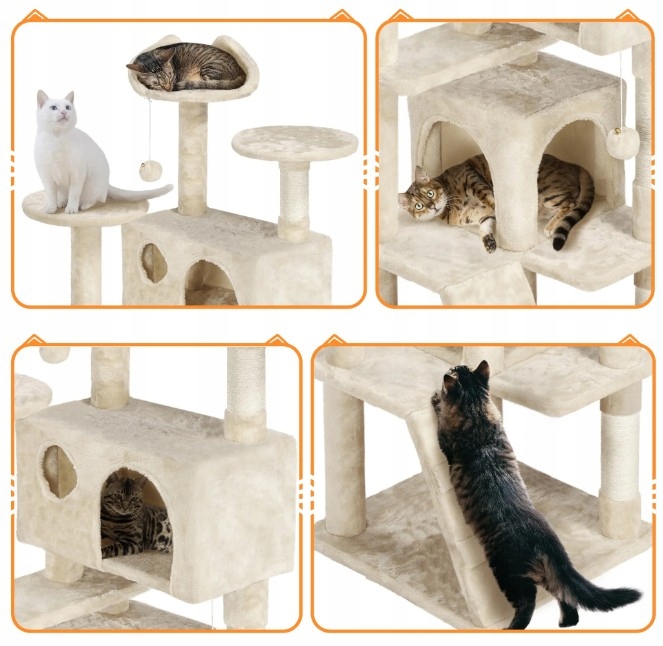 Pionowy plac zabaw – Na tym 5-stopniowym drapaku Twoje kocięta mogą bawić się pluszowymi piłkami, odpoczywać na platformach, chować się w kocich jaskiniach, wspinać się, skakać i ostrzyć pazury.