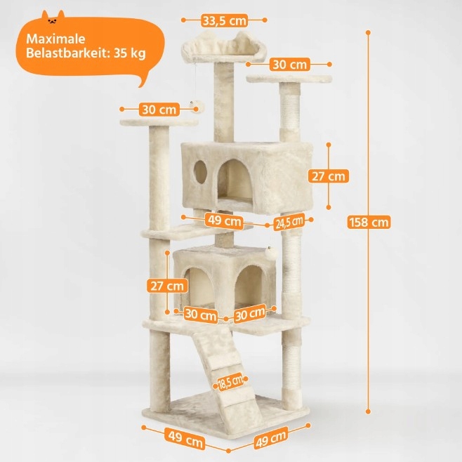 Zbuduj przytulny zamek dla swoich kociąt! Od góry do dołu ten 5-poziomowy drapak składa się z 3 platform widokowych, 2 jaskiń dla kotów, 3 bali sizalowych, 2 wiszących pluszowych kul i 1 drabiny. Na nim tygrysy domowe mogą bawić się piłkami, obserwować i odpoczywać na platformach widokowych, ostrzyć pazury na pniach sizalowych i relaksować się w kociej jaskini. Ten pionowy plac zabaw może stać w rogu domu, a także służyć jako mebel dekoracyjny.